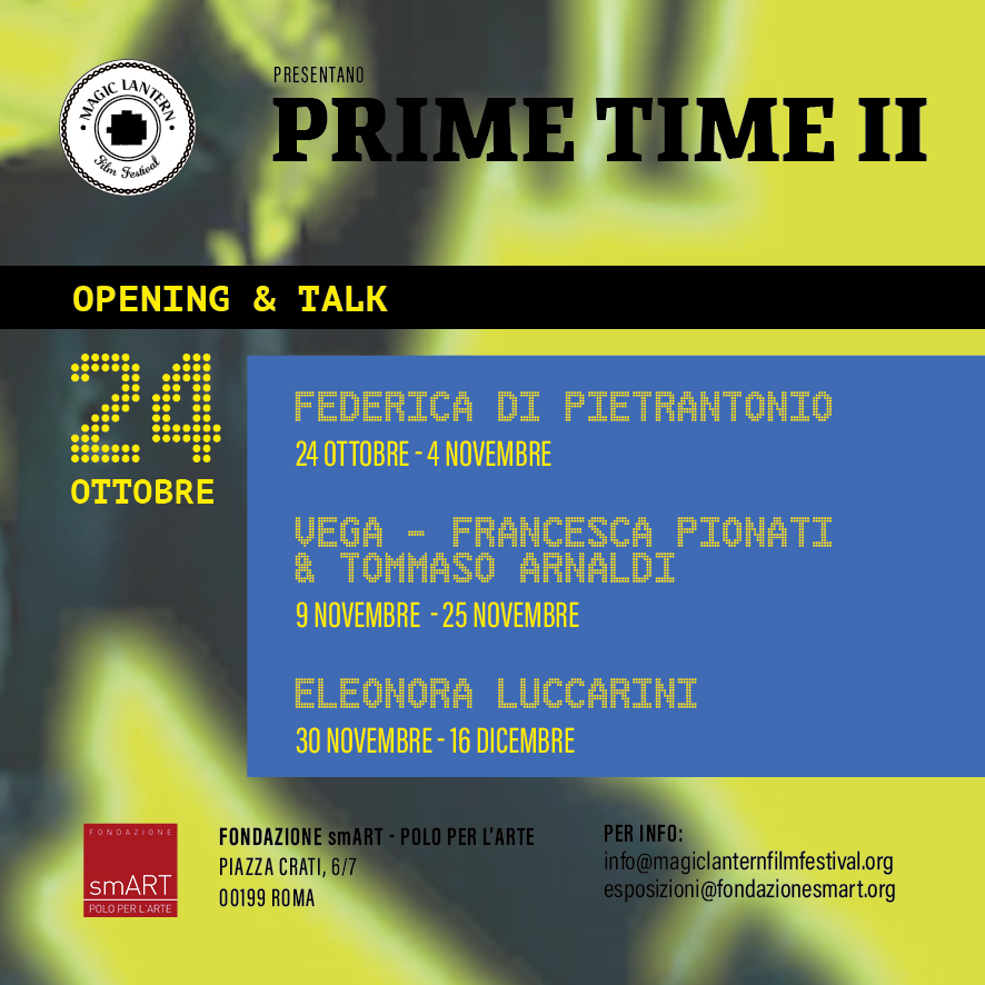 Magic Lantern Film Festival, in collaborazione con Fondazione smART – polo per l’arte, presenta la seconda edizione di Prime Time: un programma di screening ed eventi, realizzato per la prima volta nel 2021, che intende approfondire le modalità e le diverse espressioni attraverso cui l’immagine in movimento è adottata dalle poetiche di alcuni protagonisti dell’arte emergente italiana, con l’intento di dare visibilità agli immaginari e alle metodologie degli artisti e filmmaker coinvolti.