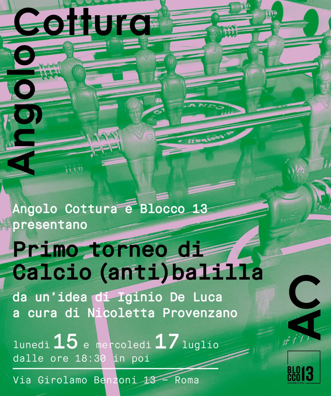 Angolo Cottura e Blocco 13 danno il via alle iscrizioni per il Primo torneo di Calcio (anti)balilla che si terrà il 15 e il 17 luglio dalle ore 18:30 presso Blocco13, in via Girolamo Benzoni, 13 – Roma.
