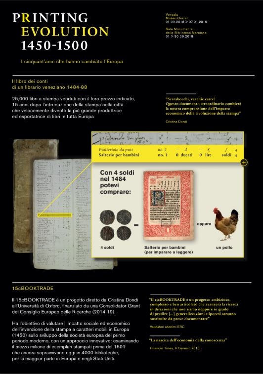 La mostra documenta l’impatto della rivoluzione della stampa sullo sviluppo economico e sociale della prima Europa moderna. Un percorso di scoperta attraverso strumenti digitali e metodi di comunicazione innovativi, che permettono di documentare e rendere accessibili decine di migliaia di dati raccolti da un ampio network internazionale – coordinato dal progetto 15cBOOKTRADE dell’Università di Oxford – in anni di rigorose ricerche