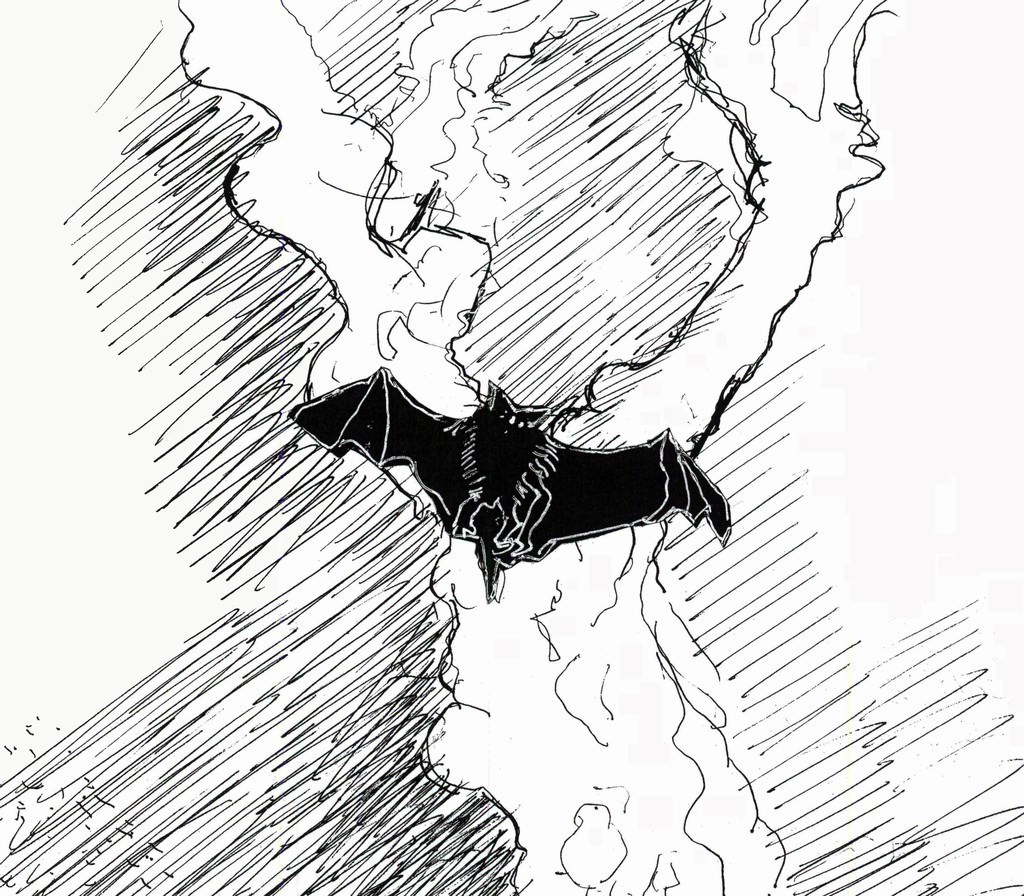Un pipistrello vola ad ali spiegate fra gli alberi e un altro uccello simile ad una cicogna sembra covare al suolo Questa l’installazione all’aperto che Priscilla Burke presenta nel giardino dell’Associazione Culturale TRAleVOLTE.