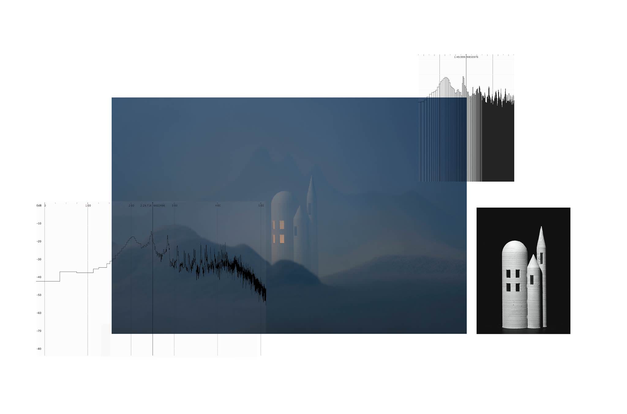 In “Spectrum” lo studio di spettri audio è il punto di partenza per una rappresentazione fotografica del suono. Attraverso la decomposizione di ogni spettro in brevi intervalli temporali, strutture ricorrenti appaiono ripetersi centinaia di volte in uno stesso diagramma. Queste “immagini” divengono la base per una libera interpretazione di linee in (pre)oggetti architettonici virtuali, poi resi fisici grazie alla stampa 3D.