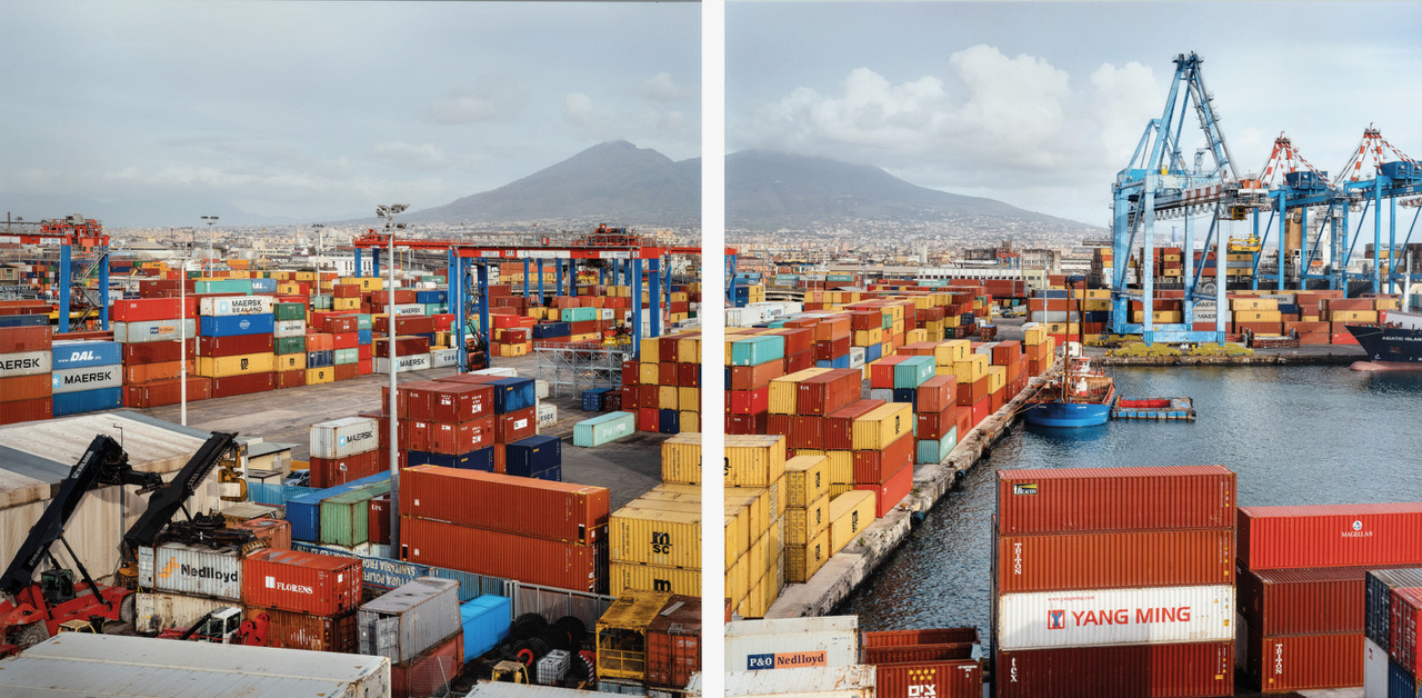 L’esposizione si apre con un grande dittico di Angelo Antolino che immortala i container del porto di Napoli e che inquadra fin da subito come non ci si trovi in uno spazio canonicamente bello ma dove davvero il tema del mare viene indagato nelle sue molteplici versioni; il mare come luogo di lavoro è anche nelle fotografie di Carlo Bevilacqua, di Renzo Tortelli e di Luciano D’Alessandro che realizzano veri reportage di denuncia sociale. Non mancano gli scatti di grandi maestri come Gianni Berengo Gardin con la famosa immagine dell’auto parcheggiata sulla spiaggia in Inghilterra da cui due anziani guardano il mare; Nino Migliori con il suo celebre tuffo; il mare diventa lirico e poetico negli scatti di Mimmo Jodice, mentre le fotografie a colori dei mari di Franco Fontana richiamano astrazioni pittoriche; immancabili le composizioni ardite e geniali di Luigi Ghirri.
