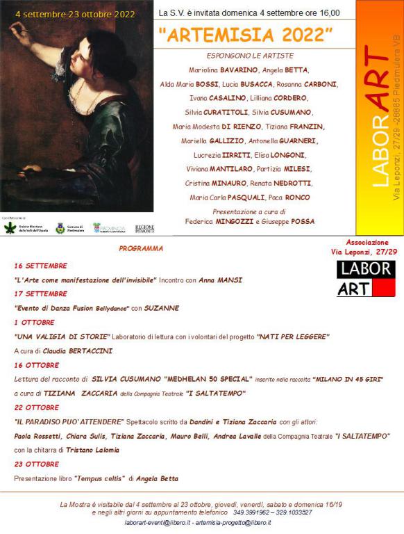 Si inaugura il 4 settembre alle ore 16,00 il “PROGETTO ARTEMISIA” promosso dall’Associazione LaborART e patrocinato dalla REGIONE PIEMONTE, dalla PROVINCIA del VCO, dal COMUNE di PIEDIMULERA e dall’UNIONE MONTANA delle VALLI dell’OSSOLA, si ispira alla grande artista Artemisia Gentileschi.