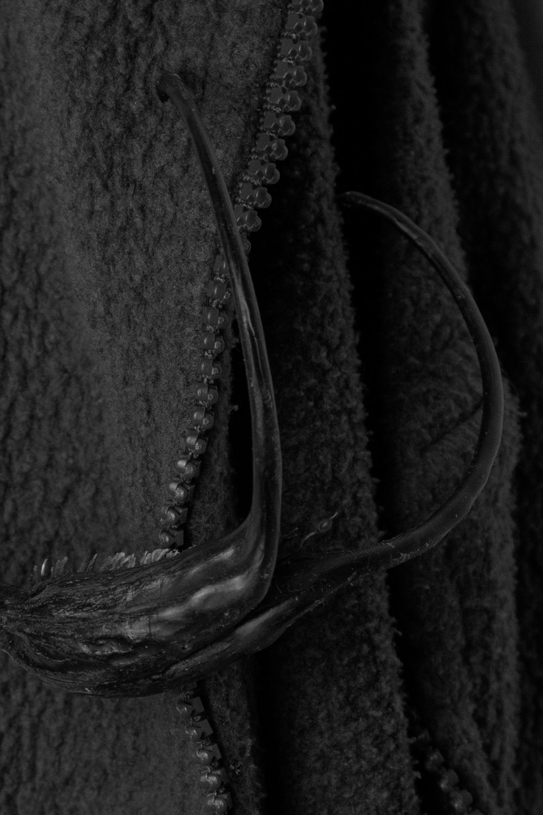 Il pelo animale è qui sostituito da indumenti commerciali, prodotti in serie, ritratti in scatti fotografici ravvicinati che ne