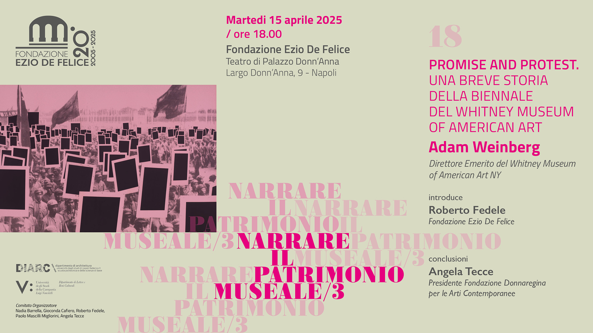 L’appuntamento è in programma per martedì 15 aprile 2025, alle ore 18, presso il Teatro di Palazzo Donn’Anna (Largo Donn’Anna, 9 – Napoli). L’incontro, 18° della rassegna, dal titolo "Promise and Protest: una breve storia della Biennale del Whitney Museum of American Art", sarà introdotto da Roberto Fedele della Fondazione Ezio De Felice e si concluderà con l’intervento di Angela Tecce, Presidente della Fondazione Donnaregina per le Arti Contemporanee.