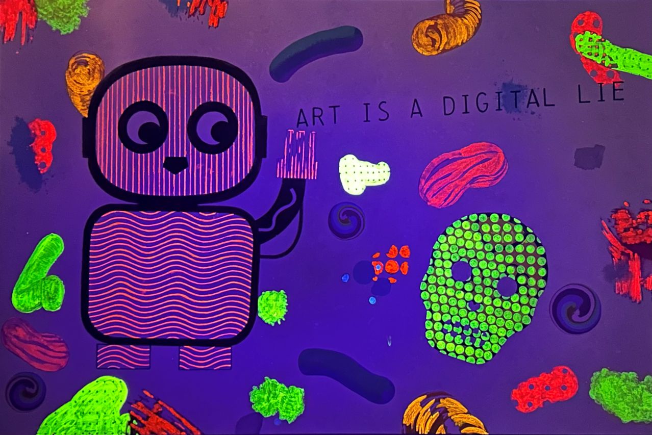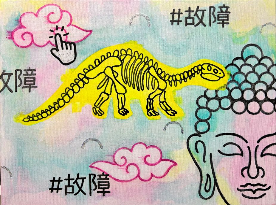 La mostra costruisce un campo visivo sospeso tra iconografia infantile, simboli post-digitali e allegoria apocalittica. L’artista elabora una visione di “pseudo-ingenuità” strategica: creature cartoonesche, scheletri di dinosauro, ecc. che concorrono a formare un ecosistema iconico de-storicizzato…