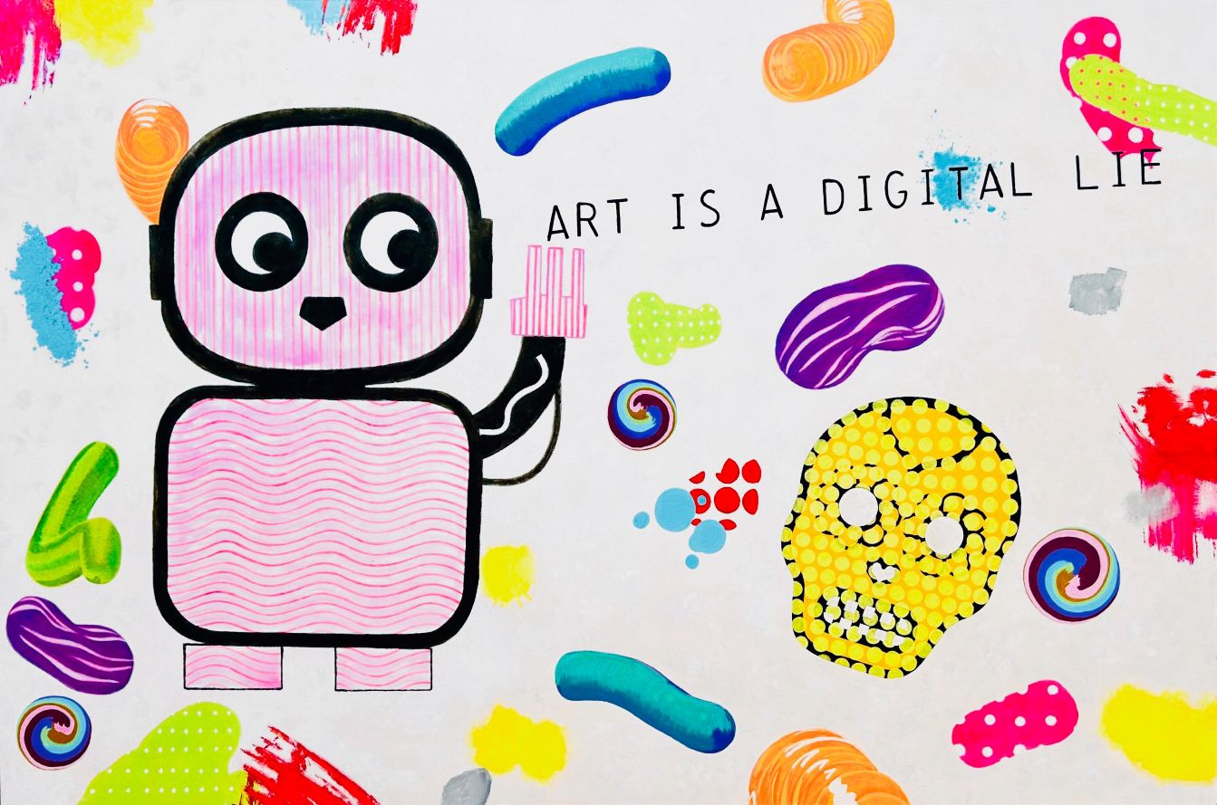 La ricorrenza di hashtag (#), personaggi videoludici pixelati, icone gestuali d’interfaccia e testi dichiarativi in inglese (come ART IS A DIGITAL LIE) indica che l’immagine non rappresenta più la realtà, ma l’ambiente mediale stesso. Questi elementi non funzionano come citazioni, bensì come struttura dell’immagine, configurando una sorta di iconografia popolare post-digitale: i motivi visivi non derivano più dall’esperienza naturale o dalla tradizione religiosa, ma dalla cultura dell’interfaccia, dal videogioco e dalla sintassi dei social media. In questo senso, la “profezia” non è più rivelazione teologica, bensì previsione culturale dell’era algoritmica — il futuro del visivo sarà generato dal linguaggio delle piattaforme piuttosto che dall’esperienza del mondo…