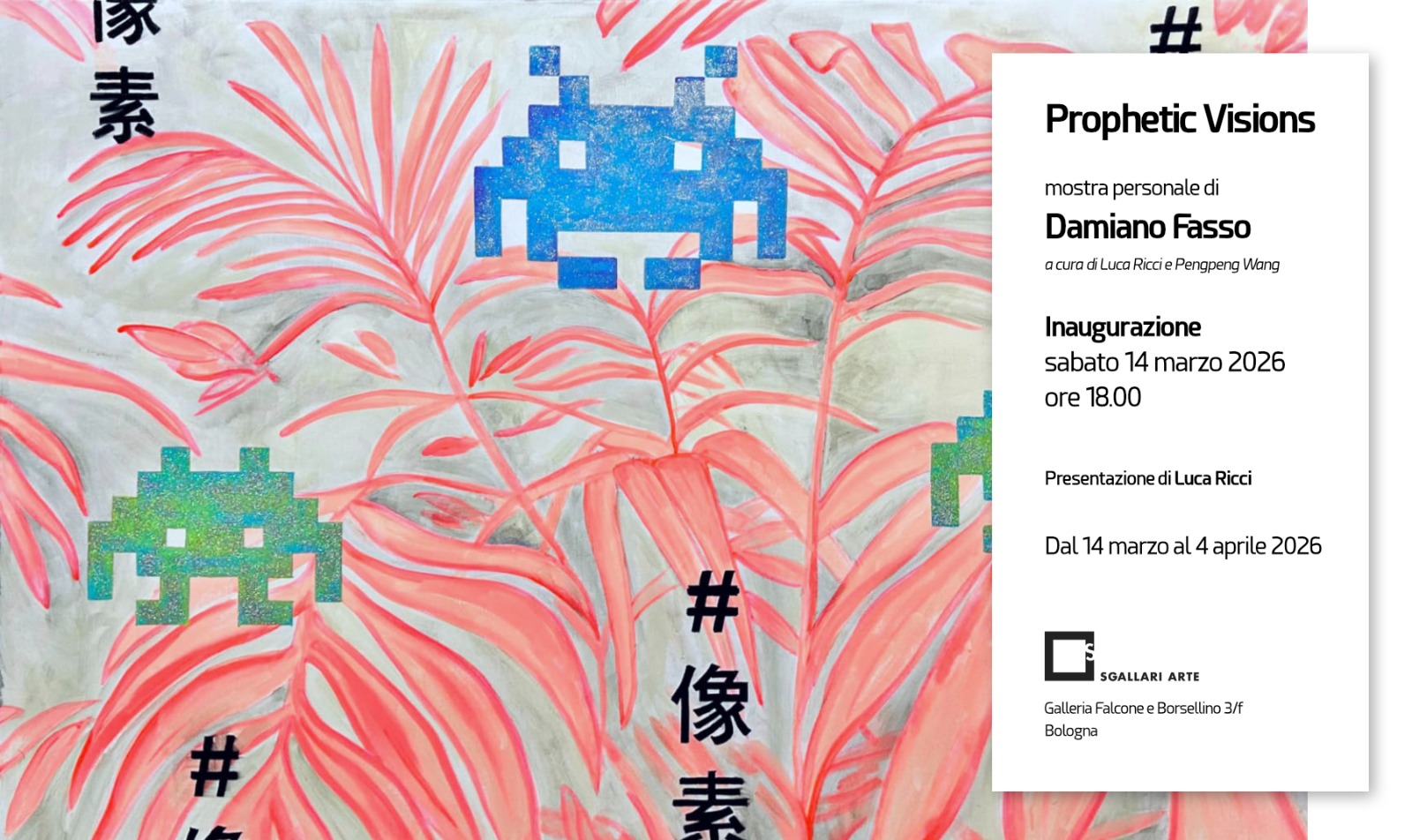 La mostra personale di Damiano Fasso, Profetic visions, costruisce un campo visivo sospeso tra iconografia infantile, simboli post-digitali e allegoria apocalittica. In queste opere l’artista, attraverso un linguaggio materiale low-fi e una grammatica figurativa semplificata, elabora costantemente una visione di “pseudo-ingenuità” strategica: creature cartoonesche, alieni pixelati, scheletri semplificati, astronauti, pillole, scheletri di dinosauro, caratteri orientali simbolizzati e hashtag dei social media concorrono a formare un ecosistema iconico de-storicizzato. Tale sistema rimanda tanto all’omologazione della cultura visiva globalizzata quanto alla condizione frammentata del soggetto contemporaneo entro ambienti algoritmici e strutture di consumo…