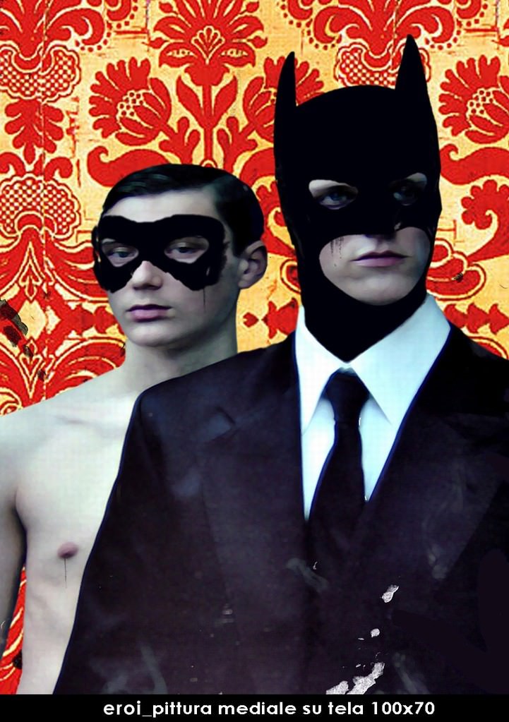 Se si trattasse di un film o di uno sceneggiato, e non già di una mostra, la presenza di Massimo Festi verrebbe definita un’amichevole partecipazione, una prestigiosa comparsata. Per questo giovane artista il fumetto non rappresenta ancora una ricerca organica, men che meno totalizzante. Siamo a livello di alcuni riusciti tentativi all’interno di una più vasta sperimentazione tecnica ascrivibile al concetto di pittura mediale. Ma i suoi Batman e Robin, omosessuali seppur con allusiva discrezione e la sua Cat Woman, che annuncia la fine della festa, sono davvero degni di nota: affascinanti quanto inclassificabili perché sembrano capaci di proiettarci in uno spazio tempo indefinito-indefinibile.