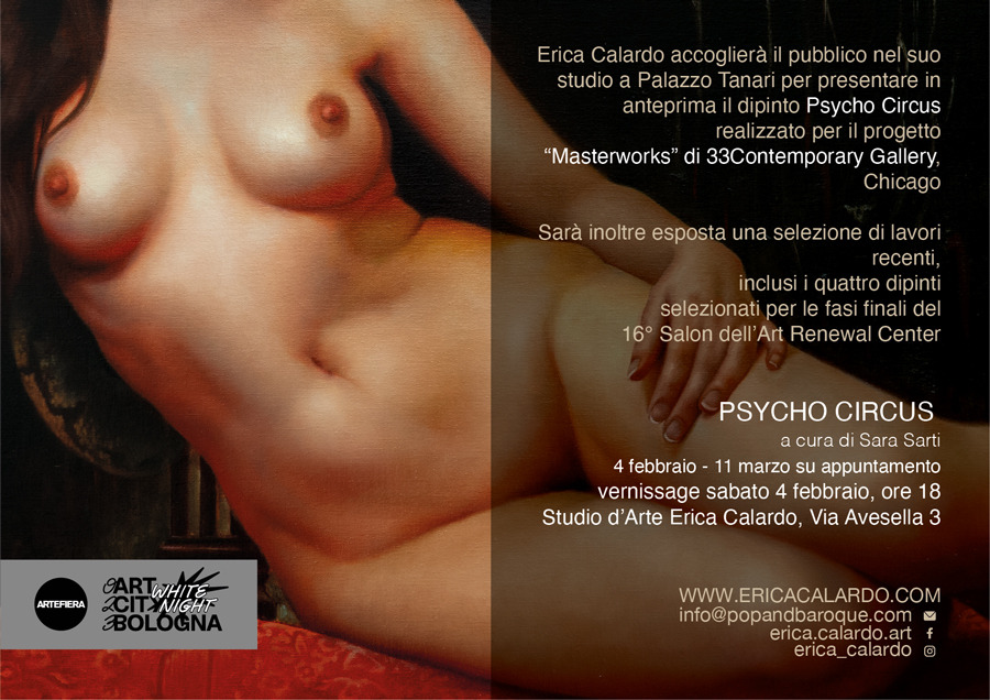 Nell’ambito di Art White Night Erica Calardo presenterà in anteprima il dipinto “Psycho Circus” selezionato da 33Contemporary, Chicago, per il progetto Masterworks. Nel suo studio in Palazzo Tanari, aperto al pubblico per l’evento, sarà esposta una selezione di opere recenti, fra cui le 6 opere selezionate per le fasi finali dell’Art Renewal Center Salon e Figurativas.