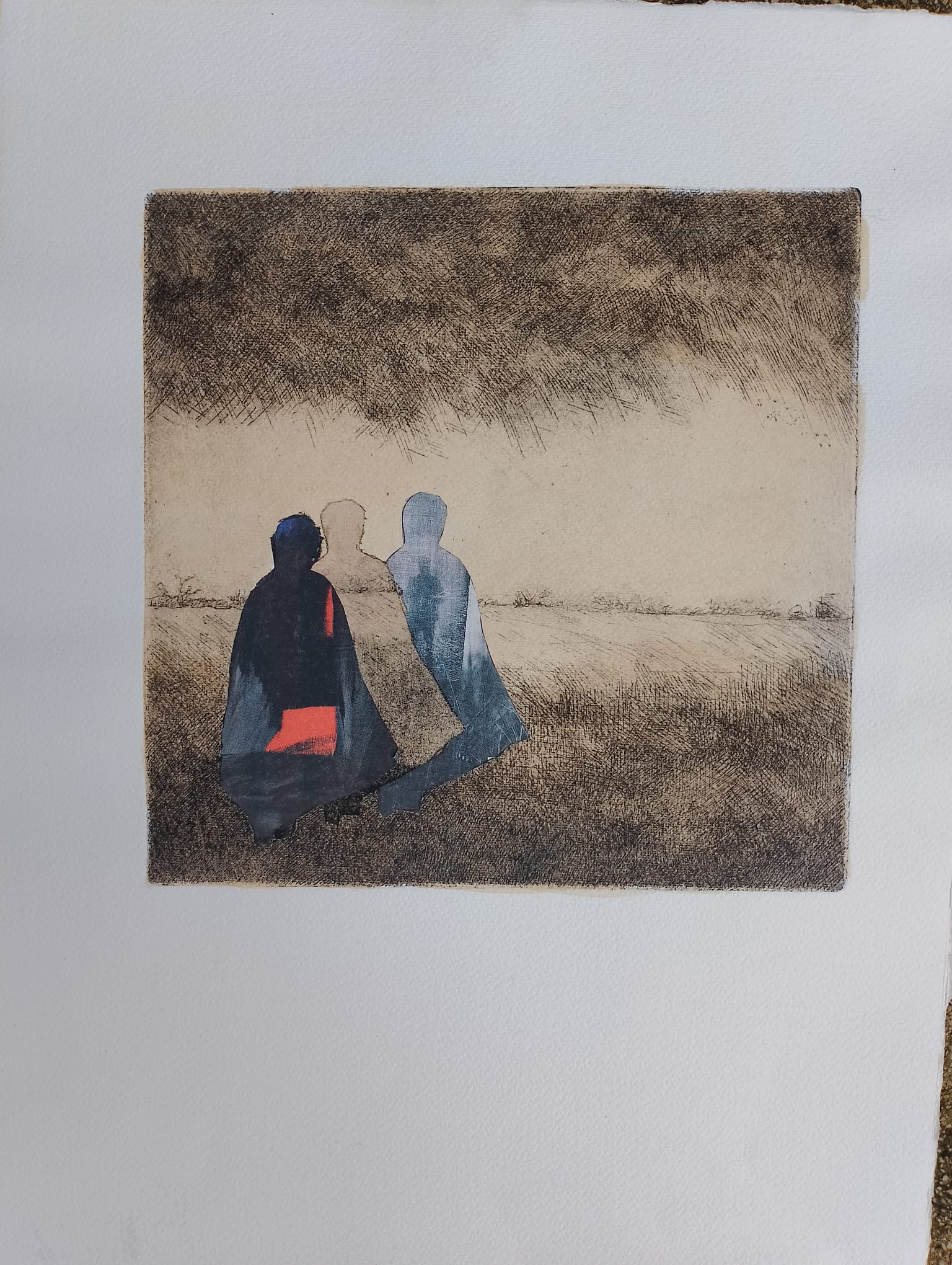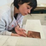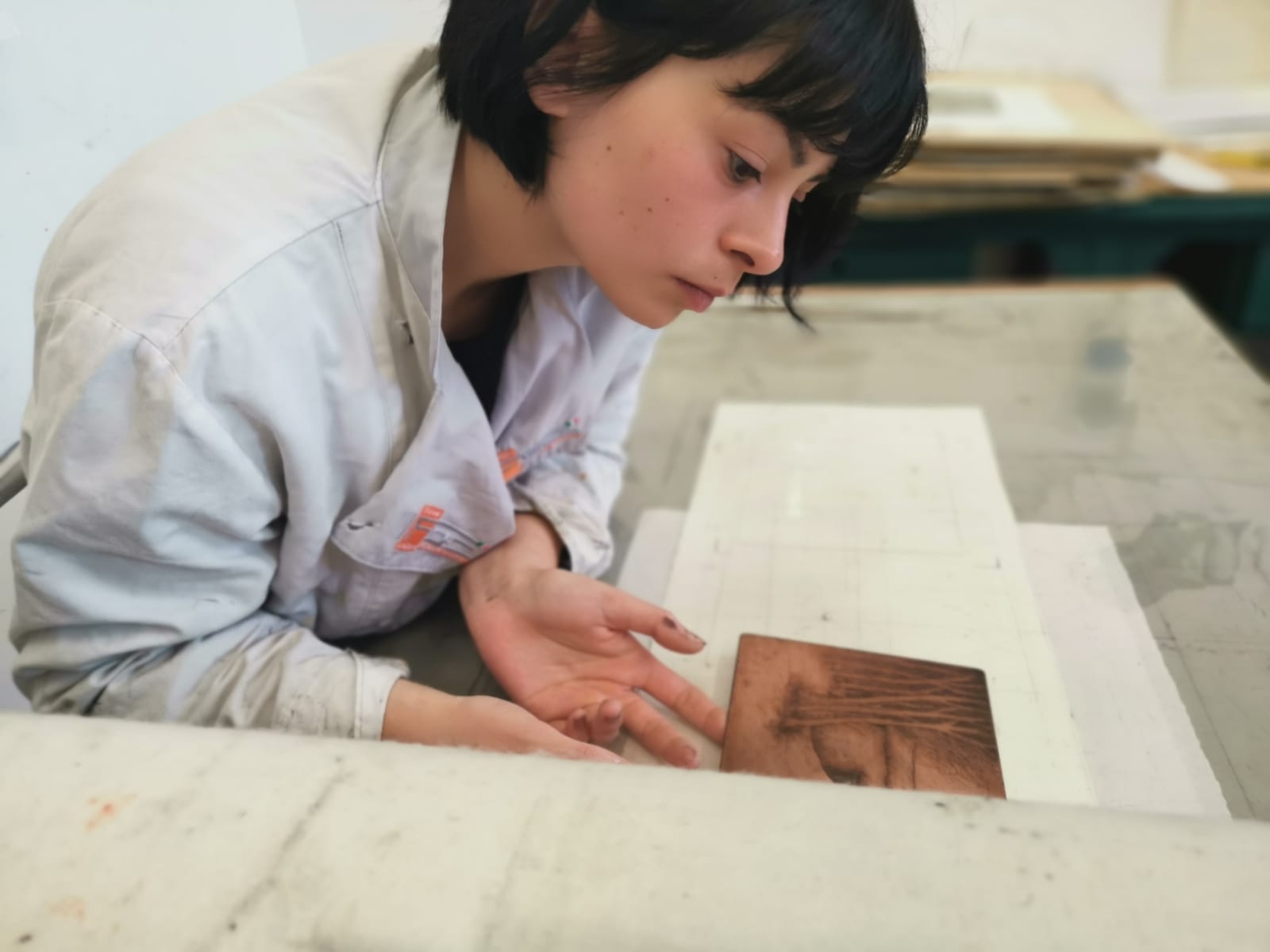 Irene Scarchilli invece affida la sua creatività all’acquaforte, tecnica che parte da un’incisione su rame con la quale realizzare una matrice che poi viene inchiostrata passando sotto ad un torchio calcografico. Il suo mondo è fatto di alberi, boschi, ma anche figure malinconiche e cieli minacciosi.