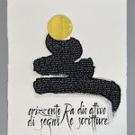 Segno e grafia si intrecciano in una composizione con continui rimandi ad esperienze che lo portano poi ad “esporre in pubblico sempre ed esclusivamente quanto già sperimentato”. Spiega di non amare le contaminazioni “per istintiva diffidenza verso tutto ciò che allude al dividere”, ciononostante nella sua opera convivono integrandosi magicamente segni di scrittura a caratteri medievali con lamine d’oro 23 carati, forme basilari a tratti ancestrali con impatti cromatici pieni e corposi.