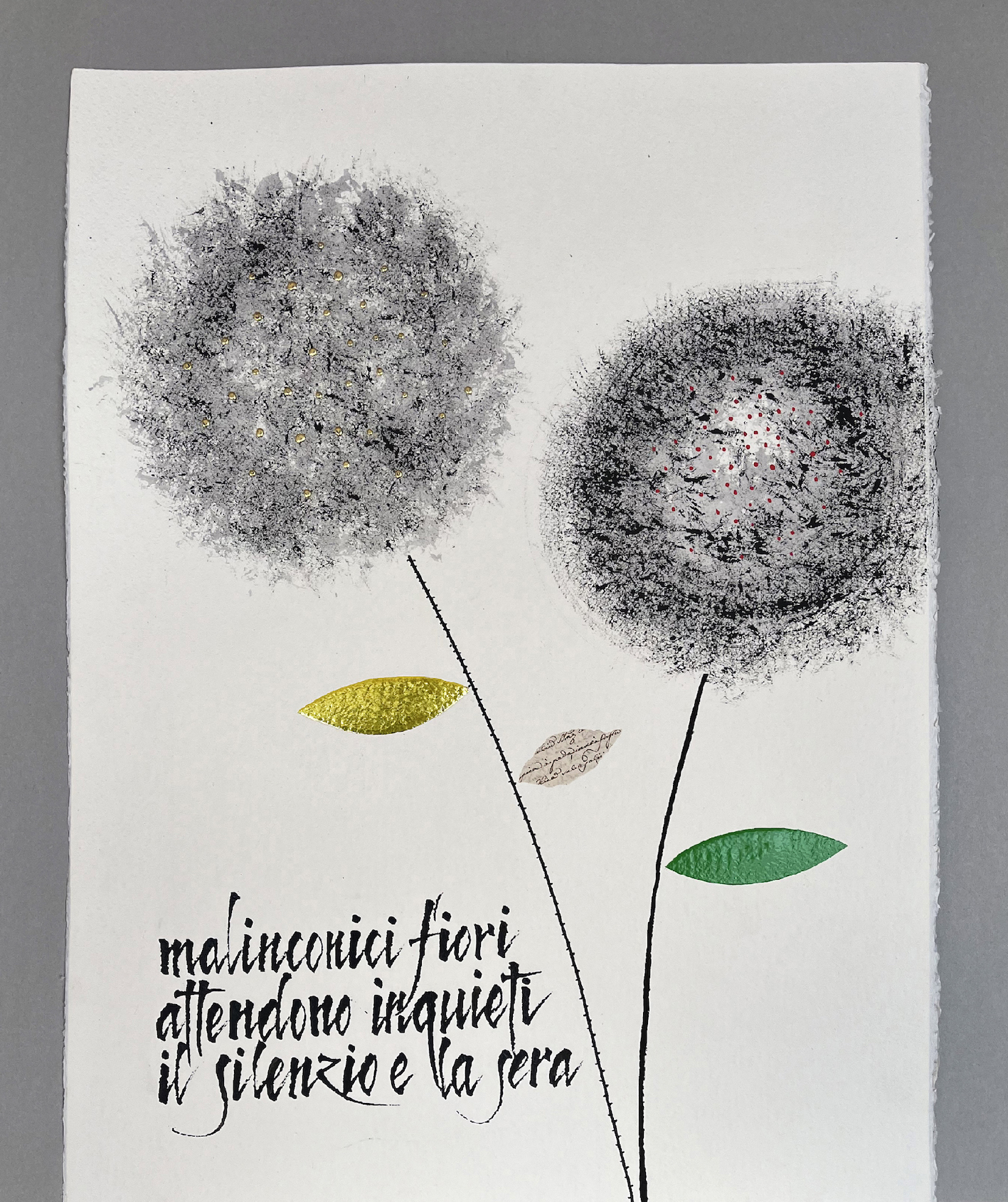 Segno e grafia si intrecciano in una composizione con continui rimandi ad esperienze che lo portano poi ad “esporre in pubblico sempre ed esclusivamente quanto già sperimentato”. Spiega di non amare le contaminazioni “per istintiva diffidenza verso tutto ciò che allude al dividere”, ciononostante nella sua opera convivono integrandosi magicamente segni di scrittura a caratteri medievali con lamine d’oro 23 carati, forme basilari a tratti ancestrali con impatti cromatici pieni e corposi.