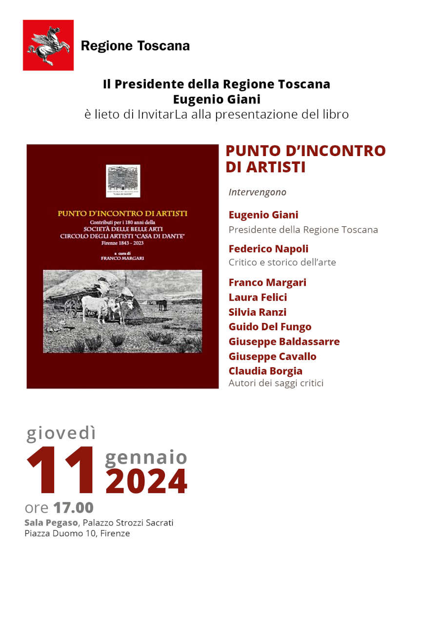 IL PRESIDENTE DELLA REGIONE TOSCANA EUGENIO GIANI E’ LIETO DI INVITARVI ALLA PRESENTAZIONE DEL LIBRO PER I 180 ANNI DELLA SOCIETA’ DELLE BELLE ARTI – CIRCOLO DEGLI ARTISTI CASA DI DANTE