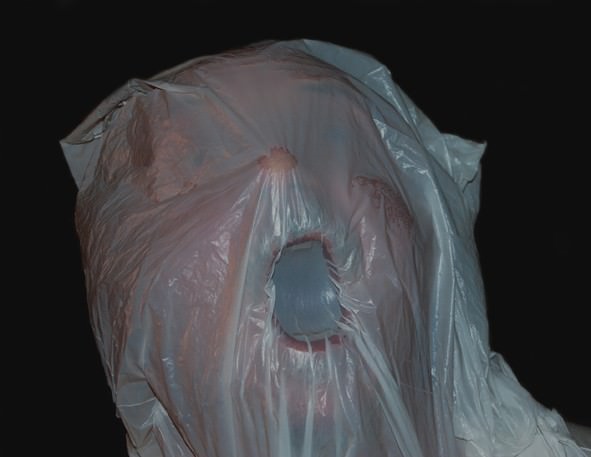 …Tale stringente problematica viene affrontata da Punto Gi in uno dei modi artistici più efficaci e convincenti, ovvero con ironia. La condizione dell’uomo d’oggi è espressa innanzi tutto dalla serie di fotografie in cui vediamo i tre artisti, Giuliano Marian, Gianni Pasotti e Giammarco Roccagli, con la testa infilata in un sacchetto di plastica che aderisce al volto e impedisce loro di respirare: ostaggi di un potere occulto, ciascuno di essi vede annullata la sua identità, tanto che al posto del volto vi è ora una sorta di maschera tragica, emblema del soffocamento di ogni vera individualità.