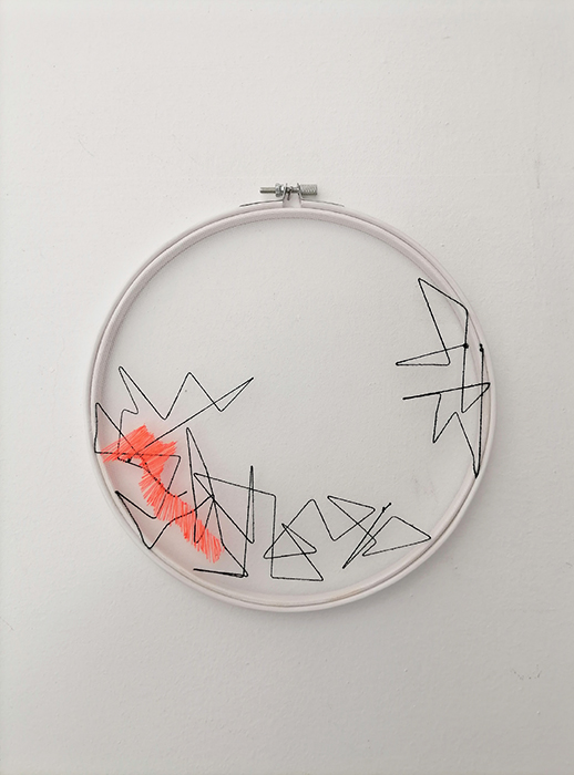 Dall’Accademia di Frosinone, Erica Cicchini presenta lavori pittorici, paesaggi su tela di ampio respiro in cui le architetture e la natura si contendono lo spazio urbano, e insieme piccoli ritratti, realizzati con spesso tratto nero, su un supporto di alluminio di cm 15x15, i coperchi delle vaschette alimentari che usiamo nelle nostre case. Angelica Loffreda sostituisce la carta con veli e chiffon su telaio, e la matita con ricami di fili neri e colori fluo, in diversi formati. Nelle trasparenze delle opere Senza titolo emerge netto un segno istintivo, realizzato senza guardare, come scrive nella sua biografia, per esprimere le emozioni interiori omettendo il senso della vista così centrale nelle arti figurative.