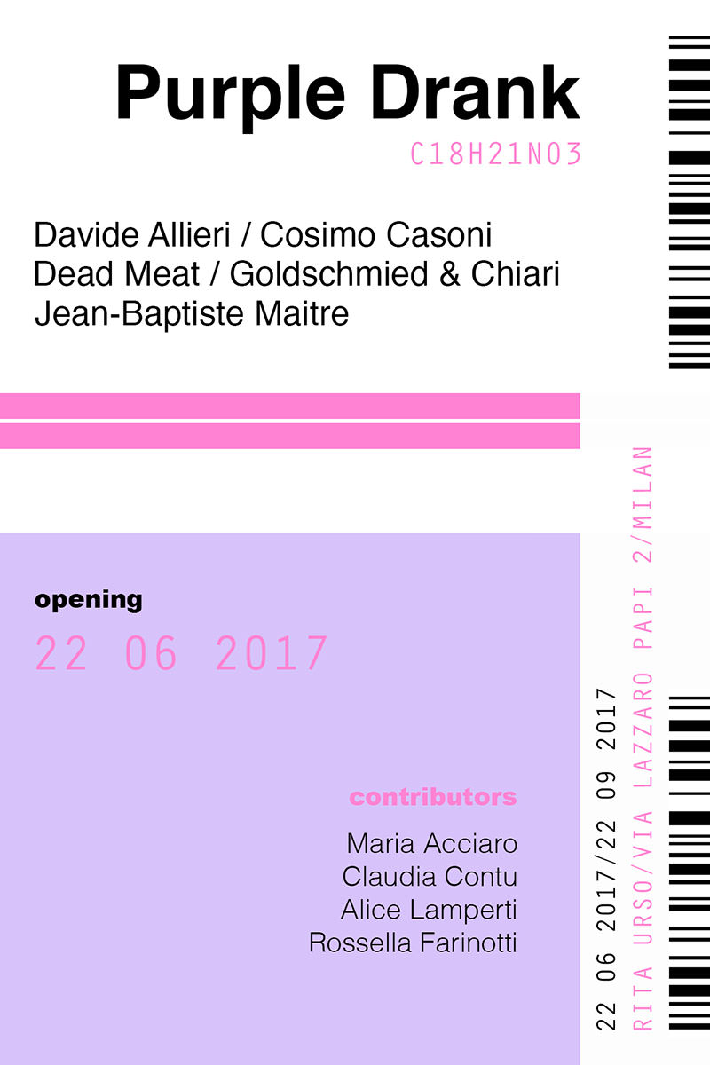 Il 22 giugno 2017 RITA URSO artopiagallery inaugura Purple Drank, un summer show con gli artisti Davide Allieri, Cosimo Casoni, Dead Meat, Jean-Baptiste Maitre and Goldieschmied & Chiari.