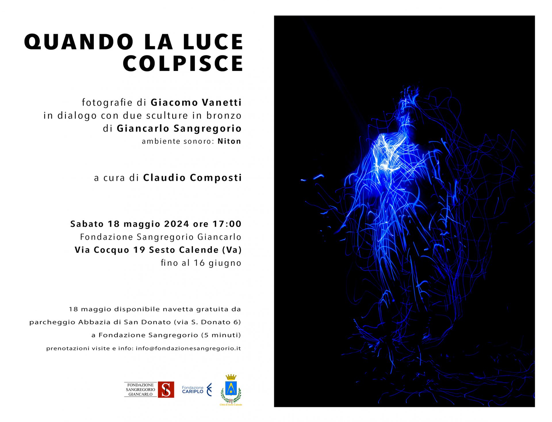 La mostra dal titolo Quando la luce colpisce, allestita negli spazi dell'Atelier Hartman, un suggestivo edificio di stile nordico della Fondazione Sangregorio in via Cocquo 19 a Sesto Calende (Va), dal 18 maggio al 16 giugno 2024, presenta una selezione di lavori del fotografo Giacomo Vanetti a cura di Claudio Composti, con il patrocinio del Comune di Sesto Calende. Il fotografo cerca un dialogo con l'opera di Giancarlo Sangregorio e lo trova nei bronzi degli anni cinquanta realizzati dal Maestro e rappresentativi di quella fase che è stata definita dai critici "rovesciamento della forma", dove la struttura interno-esterno è ribaltata ed emerge quello che può apparire il "negativo" della forma plastica, la sua struttura interiore. In mostra, Genesi di una stirpe del 1959 e Figura ed altro, dello stesso anno.