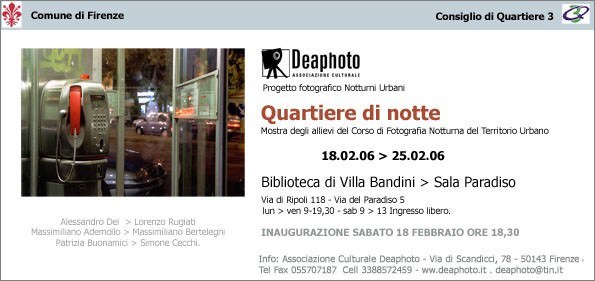 mostra fotografica degli allievi del Corso di Fotografia Notturna del Territorio Urbano organizzato dall’ Associazione Culturale Deaphoto in collaborazione Consiglio di Quartiere 3 nel Giugno 2005