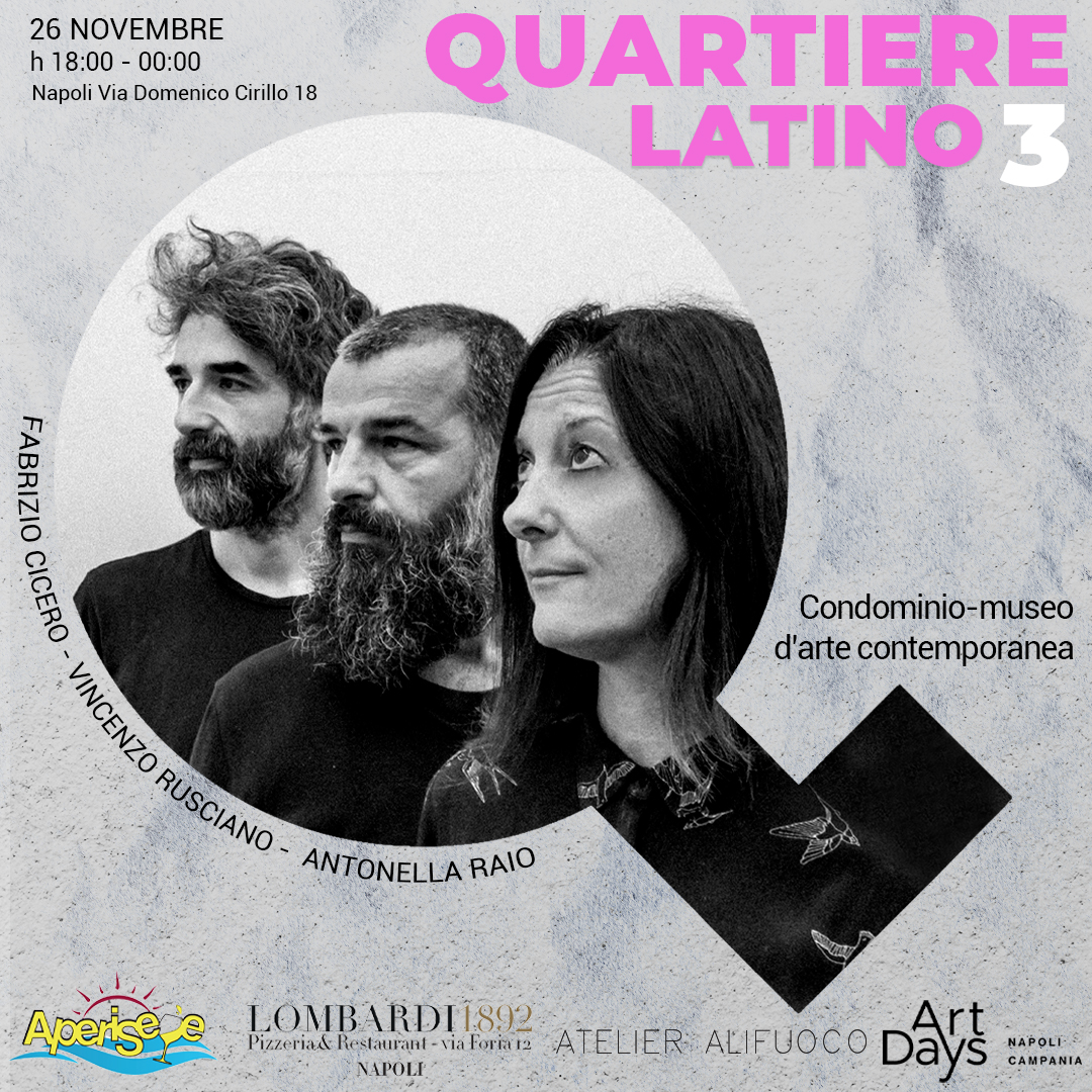 Quartiere Latino, condominio-museo d'arte contemporanea, a cura di Nicola Vincenzo Piscopo e col supporto di Atelier Alifuoco, é arrivato alla terza tappa e festeggia il suo primo anno di attività in occasione di Art Days Napoli - Campania. Sabato 26 novembre dalle 18:00, nel condominio di via Domenico Cirillo 18, a Napoli, verranno presentate le nuove opere di Antonella Raio, Fabrizio Cicero e Vincenzo Rusciano.