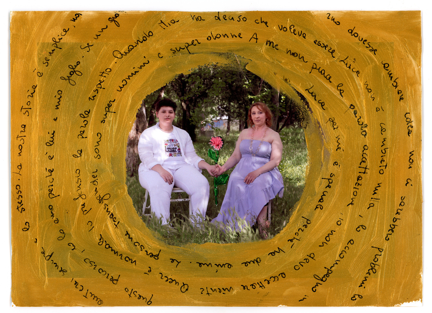 Una scelta non casuale, quella di Alessia Rollo, artista con all'attivo numerose mostre internazionali (Giappone, Spagna, Francia, Brasile, Bulgaria sono solo alcune delle nazioni che hanno ospitato una sua personale), che ha scelto di andare oltre la staticità della fotografia per unire segno e significante. Una decisione maturata dall'ascolto delle storie e delle testimonianze delle persone incontrate, in grado di riportare incisivamente il loro vissuto anche a livello iconografico: per dare spazio alle voci, alle esperienze, alle parole raccontate. Per rendere del tutto inclusiva la partecipazione alla narrazione.
