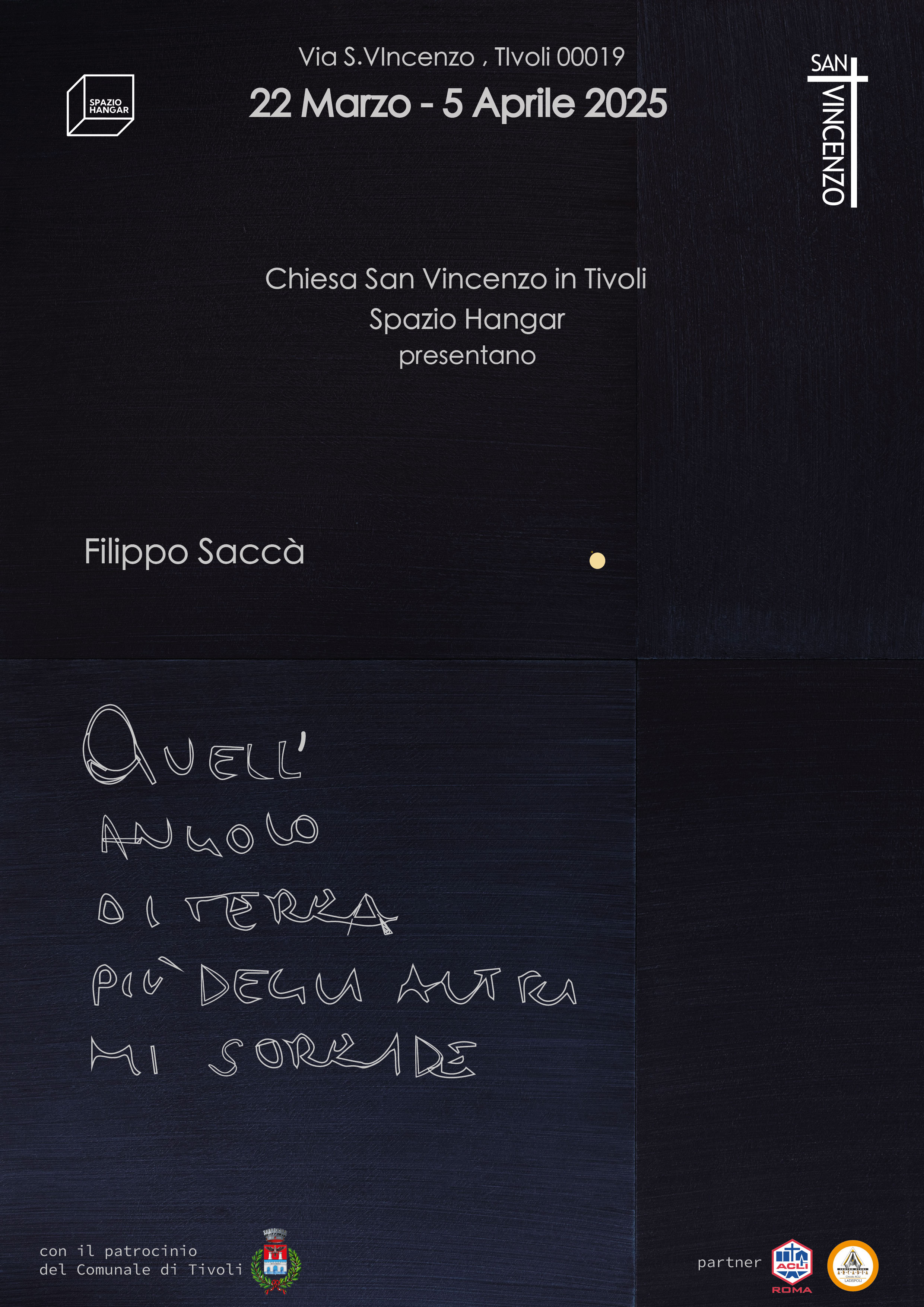SPAZIO HANGAR è lieto di presentare in collaborazione con la Chiesa di San Vincenzo Martire, Quell’Angolo di Terra mi sorride più degli altri, mostra personale di Filippo Saccà curata da SPAZIO HANGAR e con testo critico di Andrea Bardi, Critico e Storico dell’Arte, che inaugurerà il giorno Sabato 22 Marzo dalle ore 18:30 all’interno degli ambienti sacri della Chiesa in Via S. Vincenzo a Tivoli, con il patrocinio dell’Amministrazione Comunale di Tivoli, delle ACLI di Roma (Associazioni Cristiane Lavoratori Italiani Aps) e in partnership con CIRCOLO ACLI ARCADIA APS.