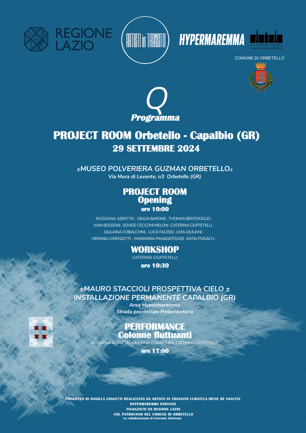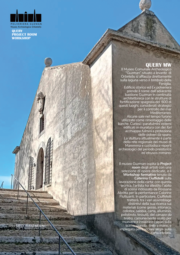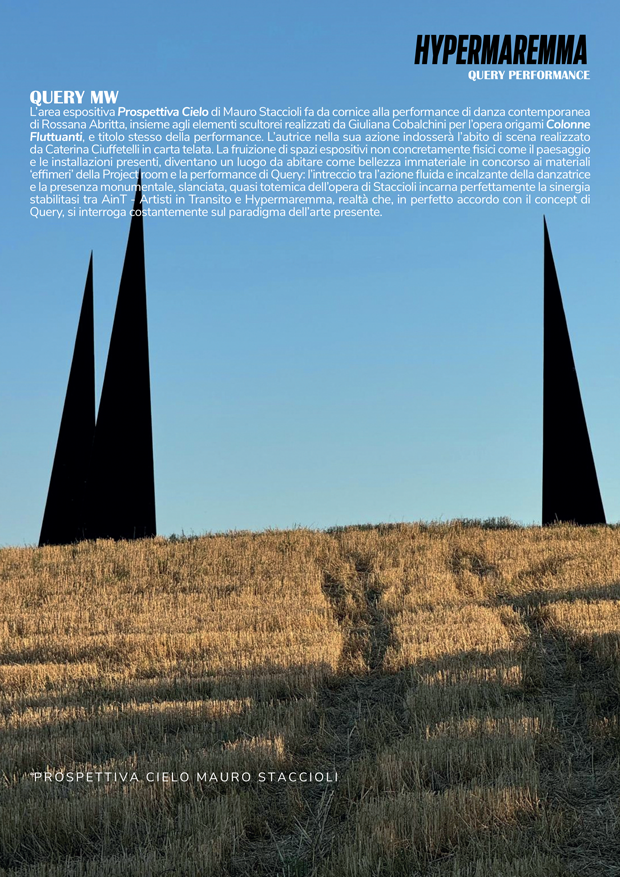 QUERY MW, col patrocinio del comune di Orbetello, transiterà dal 26 al 30 settembre nel Museo Polveriera Guzman, dove si accenderà la project Room degli artisti con materiali leggeri ed effimeri. Seguita dal display espositivo aperto al pubblico il 29 settembre 2024, insieme a un workshop d’arte sul materiale carta tenuto da Caterina Ciuffetelli, e una performance di danza contemporanea in area Land Art Hypermaremma Prospettiva Cielo di Mauro Staccioli, Capalbio, di Rossana Abritta. Insieme agli elementi scultorei realizzati da Giuliana Cobalchini per l’opera origami Colonne Fluttuanti, e titolo stesso della performance. L’autrice nella sua azione indosserà l’abito di scena realizzato da Caterina Ciuffetelli in carta intelata.