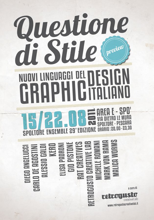 Il progetto QUESTIONE DI STILE, a cura di Retrogusto Lab che si terrà dal 20 Agosto al 25 Settembre 2011 a Spoltore, si propone come una vera e propria ricognizione dei nuovi linguaggi della creatività italiana. Partendo da un inedito concetto espositivo che documenterà una campionatura ragionata di giovani talenti emergenti del graphic design italiano QUESTIONE DI STILE presenterà ambiti di ricerca e sperimentazione applicati ai più diversi settori della comunicazione visiva. In mostra i lavori di Diego Angelucci, Carlo De Agostini, Jacopo Ferretti, Kero, Elisa Padroni, Gio Pistone, RAT Creatives, Retrogusto Creative Lab, Michele Romani, Mark Von Rama, Malica Worms.
