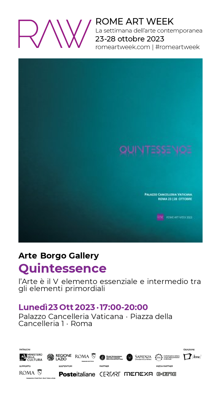 “Quintessence” è il titolo prescelto da Anna Isopo di Arte Borgo Gallery per la mostra inserita nell’VIII edizione di RAW 2023 che si svolgerà presso il Palazzo della Cancelleria Vaticana.