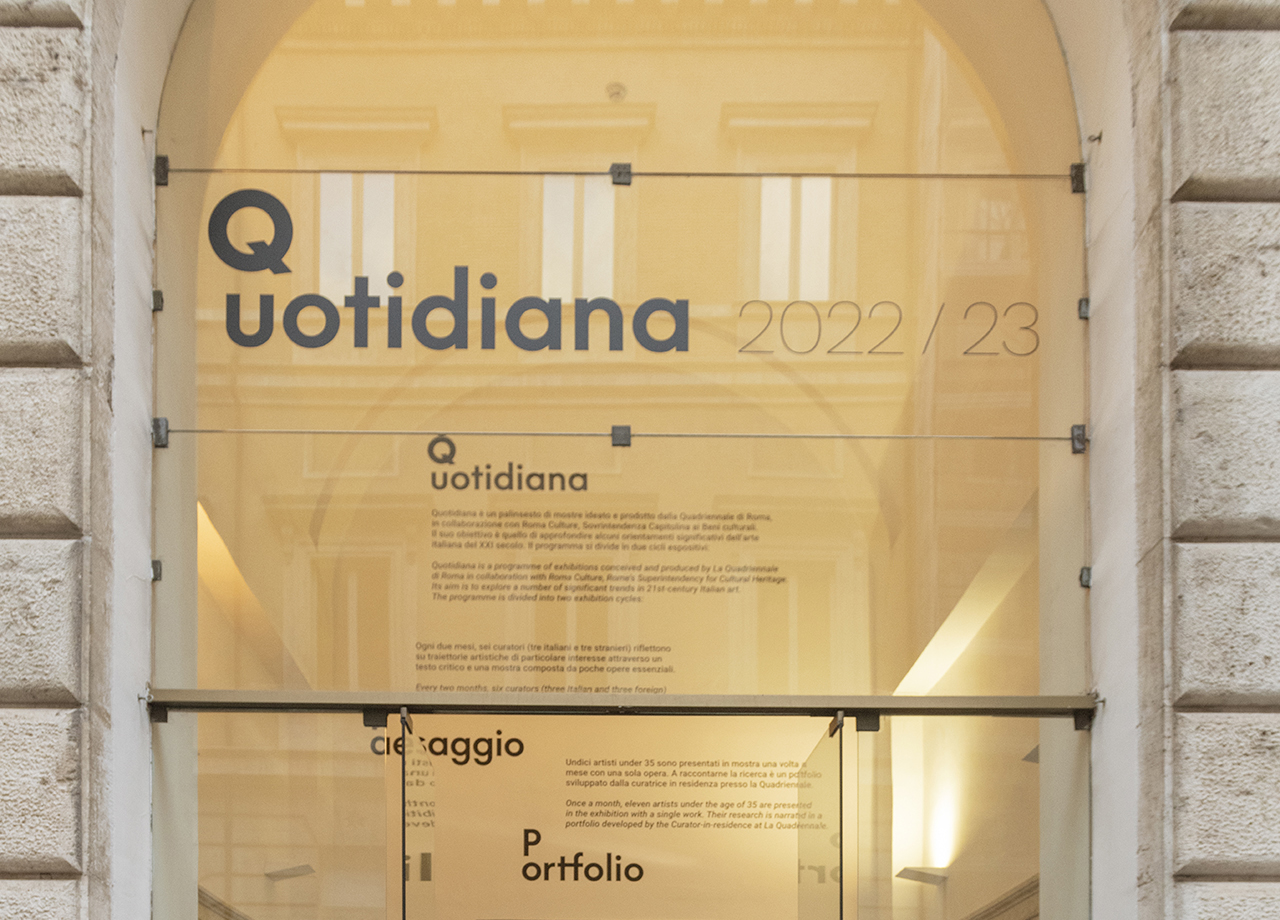 QUOTIDIANA è il programma espositivo che, a partire da settembre 2022, coinvolge le due sale al piano terra del Museo di Roma, aperte al pubblico con un palinsesto di mostre, ideate e prodotte dalla Quadriennale, con l’obiettivo di approfondire alcuni orientamenti significativi dell’arte italiana del XXI secolo. Nell’atrio d’ingresso, che connette le due sale, è allestito uno spazio di lettura dove sono messi a disposizione del pubblico i testi critici sviluppati dai curatori delle due rassegne.
