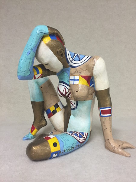 Nei suoi ultimi lavori infatti Rabarama supera quella concezione deterministica del cosmo, che vedeva l’uomo relegato, citando l’artista, a mero “computer biologico”, incapace di padroneggiare il proprio destino, per approdare ad esiti fortemente meditativi, di un vitalismo prorompente. Le sue figure umane, dalla pelle “tatuata”, cosparsa di segni tribali, retaggi di arcaiche civiltà, assumono pose concitate e ardite, come a volersi liberare dall’involucro che le attanaglia.