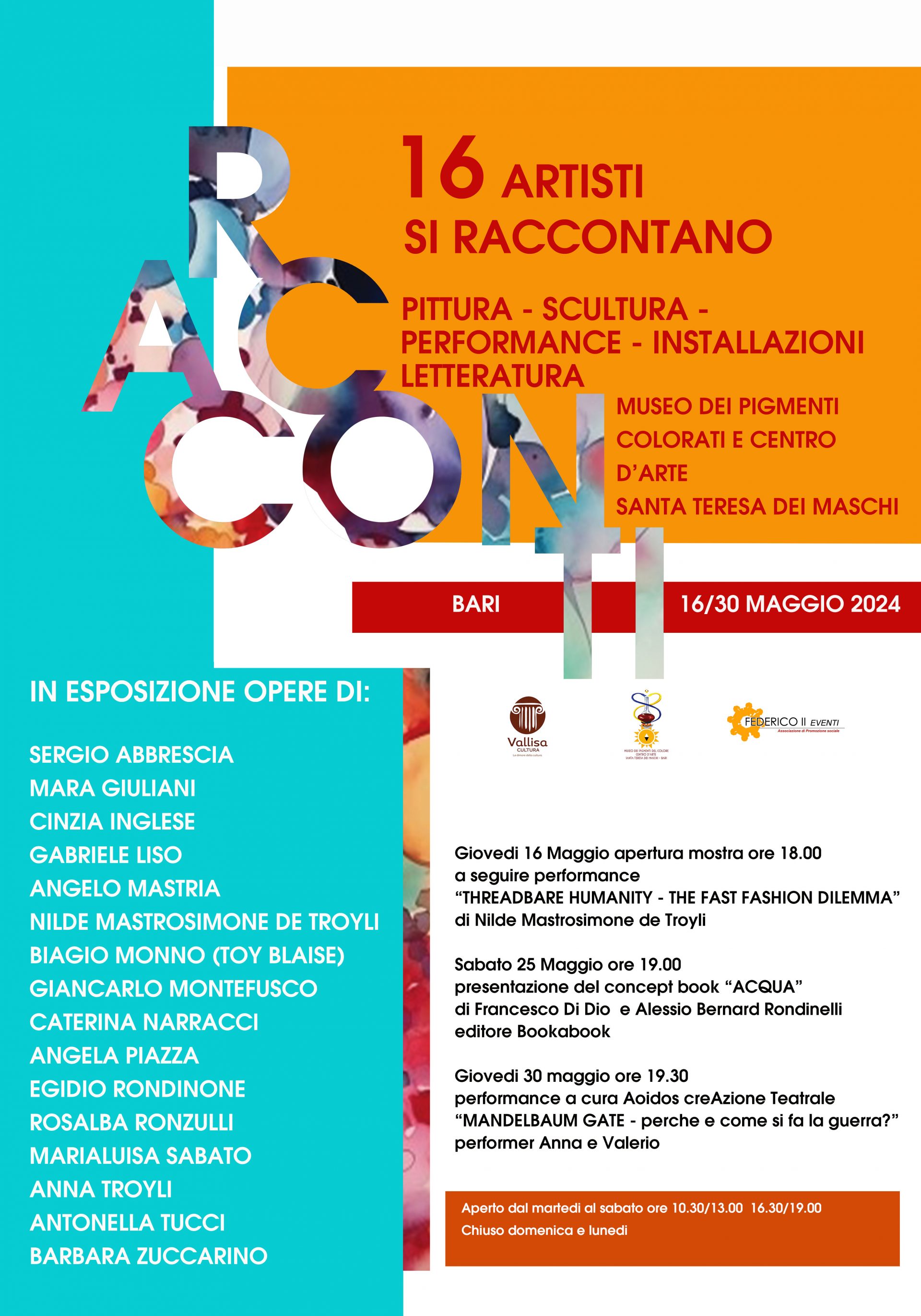 Giovedi 16 maggio presso il Museo dei pigmenti naturali colorati Centro d'arte Santa Teresa dei Maschi, alle ore 18.00 apertura della mostra "RACCONTI" pittura, scultura, installazioni, performance, letteratura, in esposizione opere degli artisti: Sergio Abbrescia, Mara Giuliani MaRt, Cinzia Inglese, Gabriele Liso, Angelo Mastria, Nilde Mastrosimone de Troyli, Biagio Monno (Toy Blaise), Giancarlo Montefusco, Caterina Narracci, Angela Piazza, Egidio Rondinone, Rosalba Ronzulli, Marialuisa Sabato, Anna Troyli, Antonella Tucci, Barbara Zuccarino. Giovedi 16 maggio ore 19.00 Performance "Threadbare Humanity-the fast fashion Dilemma" di Nilde Mastrosimone de Troyli, Sabato 25 maggio ore 19.00 presentazione del concept book "Acqua" di Francesco Di Dio e Alessio Bernard Rondinelli editore Bookabook, Giovedi 30 maggio ore 19.30 chiusura con la performance a cura di Aoidos creAzione Teatrale "MANDELBAUM GATE - perche e come si fa la guerra?" Performer Anna e Valerio