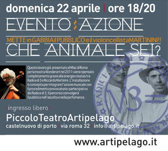 che-animale-sei-x-sito.jpgChe animale sei? è la domanda che si vuole trasmettere e infondere in un coinvolgente tragitto costruito ad hoc. Una grande gabbia, un percorso obbligato.. uno spazio compromettente volto a scatenare la reazione del pubblico che ineluttabilmente lascerà un concreto segno del proprio passaggio. L’ambiente occupato interamente da un box-gabbia sarà di volta in volta accessibile ad un numero limitato di partecipanti incanalati all’interno in un percorso prestabilito. Premendo un pulsante e rispondendo alla domanda-incipit dell’intera operazione ogni verso emesso sarà riprodotto e si aggiungerà in sequenza agli altri suoni. Riccardo Martinini, durante la serata inaugurale e in altri momenti della permanenza ad Artipelago dell’installazione, chiuso in gabbia con il suo violoncello, con una coinvolgente performance sonora incrementerà ulteriormente la provocazione, obbligando l’ascoltatore a vivere, attraverso il corpo, l’esperienza dell’ascolto, affrontando in uno scontro frontale ogni singolo visitatore. La perfomance ruota intorno alla possibilità di coinvolgere l’ascoltatore nella fatica dell’esecuzione: un ascolto fisico, ravvicinato che escluda la convenzione dell’ascolto mediato dai luoghi deputati. La ricerca musicale, lo stesso suono emesso, diventano testimoni del disagio individuale e sociale, escludono il rito e l’edonismo del concerto ottocentesco, obbligano l’ascoltatore a vivere attraverso il proprio corpo l’esperienza dell’ ascolto. Martinini coniugherà il gesto esecutivo alla scelta di restituire agli ascoltatori tre rare pagine scritte da Autori Italiani nei primi anni ’70. I brani sono dedicati ad importanti violoncellisti della precedente generazione, con i quali Martinini si è formato.