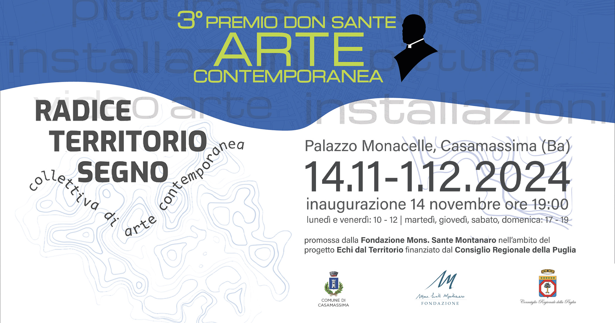 Il 14 novembre si inaugura, nelle sale al pianterreno di Palazzo Monacelle a Casamassima (Ba), Radice, Territorio, Segno, mostra collettiva di Anna Dormio, LIMBA (Francesco Paolo Cosola e Veronica Liuzzi), Andrea Schifano, Pietrangelo Pezzuto, Luisa Valenzano, a cura di Nicola Zito, Giuliana Schiavone, Luisa Valenzano, promossa dalla Fondazione Mons. Sante Montanaro, nell’ambito del progetto “Echi dal Territorio” finanziato dal Consiglio Regionale della Puglia.
