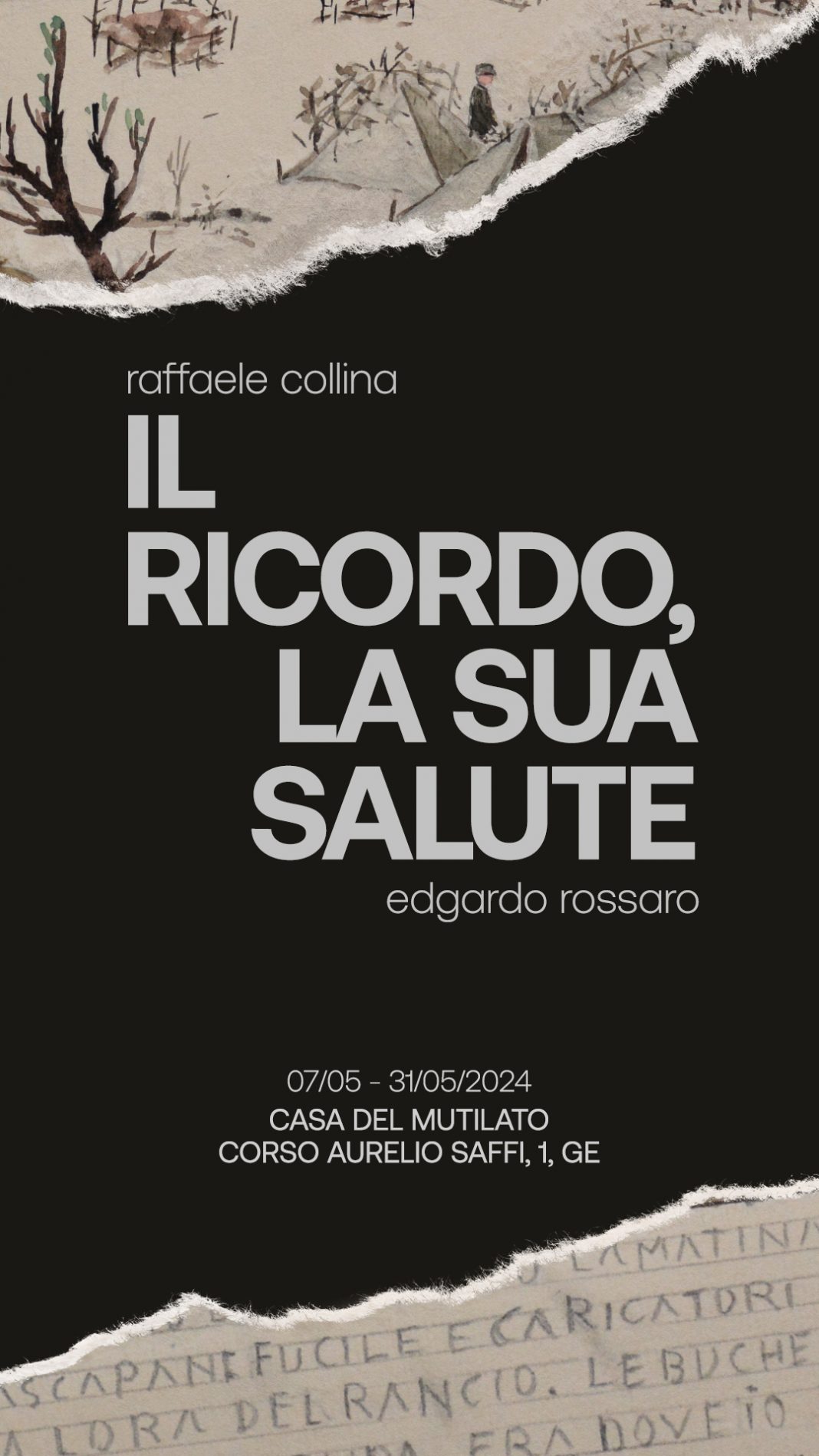 Casa del Mutilato di Genova, tramite la propria Collezione d’Arte Moderna e Contemporanea, ha la possibilità e il compito di sostenere una continua riflessione collettiva sui valori che hanno delineato (e tutt’oggi indirizzano) la propria storia di istituzione in supporto e a tutela della comunità: pace, diritti e inclusione. All’interno di un orizzonte storico scosso e sconvolto, quello che contraddistingue la quotidianità degli ultimi anni, diviene quantomai necessario mantenere costante l’attenzione sia sugli sviluppi degli avvenimenti che lo hanno compromesso sia adoperarsi singolarmente affinché la libertà non solo venga preservata ma si ricerchi laddove talvolta (ancora e drammaticamente) non sempre riesce pienamente a brillare. Il ricordo, la sua salute — seconda mostra del 2024 organizzata dalla sede genovese di Fondazione A.N.M.I.G., dopo Ombre (protagonista della rassegna internazionale “Segrete. Tracce di Memoria”) — vuole dunque stimolare, per contrasto, nel pubblico un’autocritica costruttiva volta al superamento delle soggettive tipologie d’indifferenza. In una tragica sequenza, scandita in due cupe e inequivocabili scene (raffigurate da Edgardo Rossaro e Raffaele Collina), visitatori e visitatrici potranno misurare il buio e le sue conseguenze. L’esposizione, a cura di Matteo Lenuzza, si pone come secondo e consecutivo appuntamento volto alla valorizzazione del prezioso patrimonio artistico regionale storicamente conservato dall’Associazione Nazionale Mutilati e Invalidi di Guerra. La sezione locale, rappresentata dal Presidente Guido Vinacci, prosegue e approfondisce infatti il sodalizio culturale con la sezione di Rapallo e la sua collezione (alla quale fa capo il Presidente Agostino Pendola), con un nuovo progetto. Dopo le iniziative dedicate alla trasmissione della Memoria di Alessandro Berretti — grafico pubblicitario toscano che coraggiosamente raffigurò dall’interno dei campi la propria prigionia — un nuovo momento di incontro e dialogo che si sviluppa come un’analisi delle criticità contemporanee, orientata a sostenere lo sviluppo di una Memoria del (e nel) presente nonché il contrasto di ogni forma d’indifferenza.