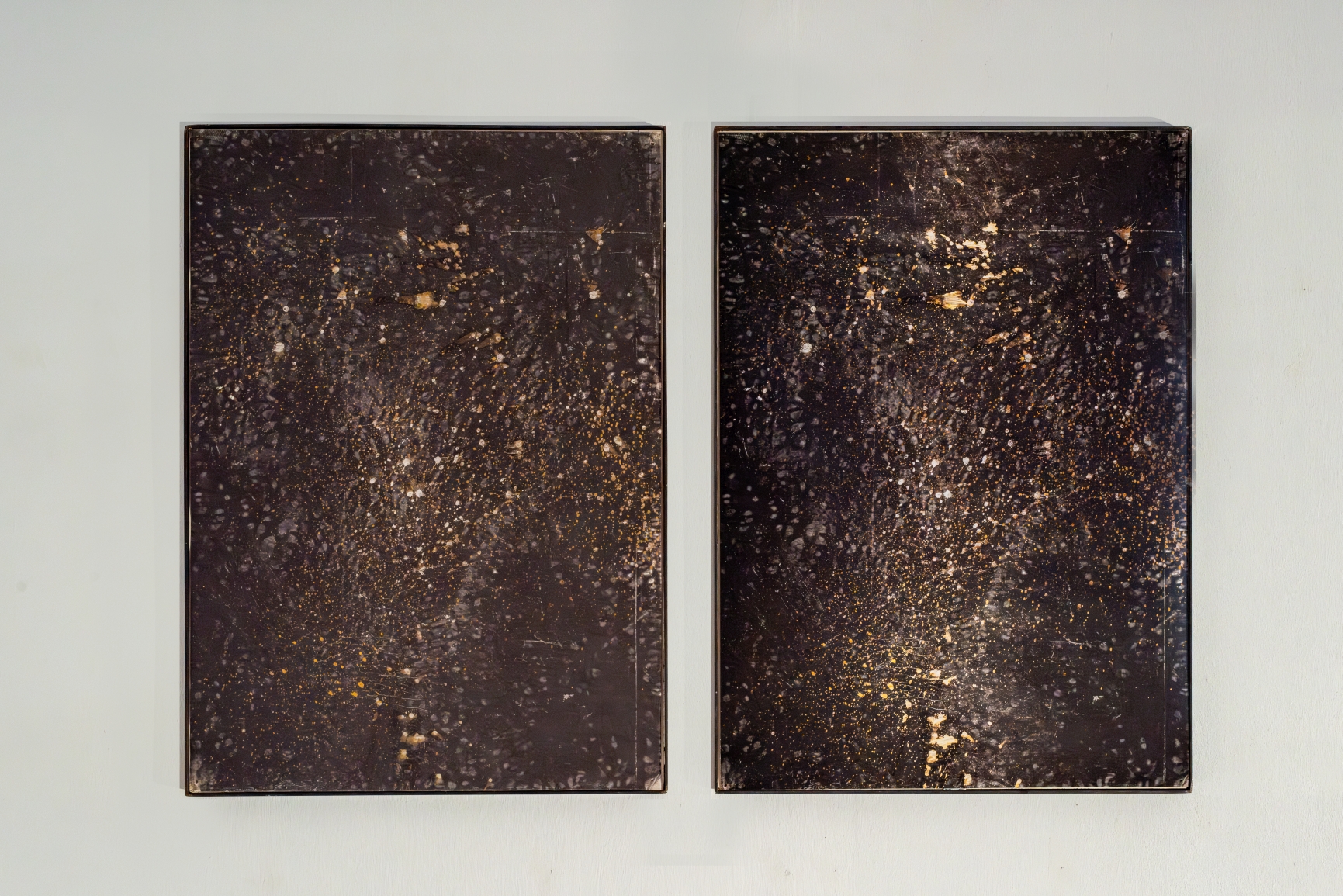 La mostra “Visivo” segue a “Varchi nel tempo” della primavera scorsa alla Galleria Monogao 21 di Ravenna, dove erano esposti gli ultimi esiti dalle serie “Carte del tempo” e “Superfici”. Quida si interessa alle categorie del tempo nella mutazione e trasmutazione della materia, quale nucleo fondante della sua ricerca artistica. Nella pratica utilizza materiali sia naturali che artificiali, in questo caso largamente usati nell’edilizia e nell’industria chimica, scelti per la loro versatilità e per contrasti, di opacità o trasparenza e in base alle diverse densità di peso, trattandoli in virtù della loro capacità di trasformazione e dialogo, dal ferro e piombo, all’argilla e gommapiuma, fogli termici e pigmenti, dai più ‘poveri’ fino all’oro.