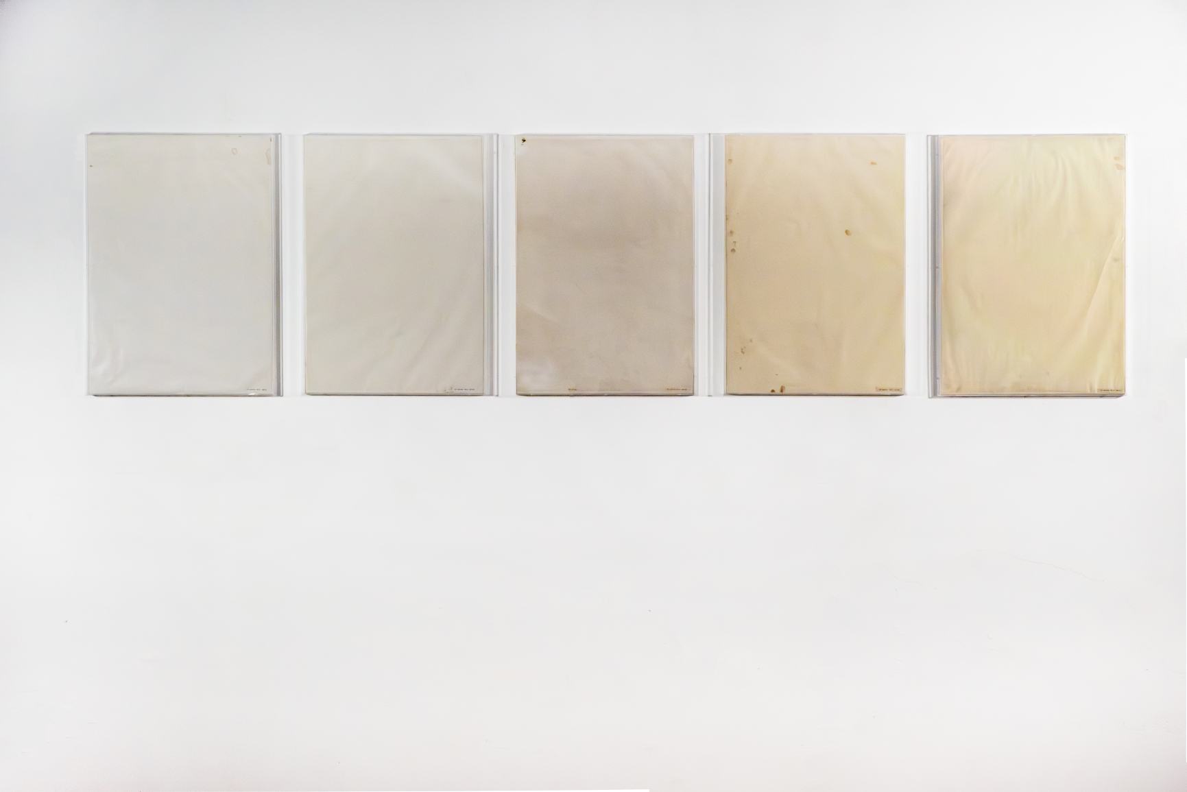 Centrale in queste opere è l’incidenza della luce, da quella diurna a quella di un proiettore, in grado di attraversare o imprimersi sulle superfici e di modellare i volumi, che motiva la scelta anche di altri materiali, come il plexiglas o la carta carbone comprendendo la carta fotografica baritata, per portare avanti un’analisi e misurazione dei fenomeni della luminosità e sulla percezione che valica la sfera del non visibile.