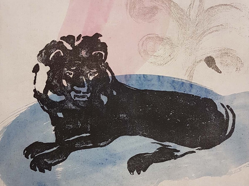 Nella serie di sei stampe di media dimensione realizzate con la tecnica della maniera a zucchero e del collage, intitolate L’impronta del Leone, Santillo sviluppa iconograficamente la figura del leone, uno dei motivi ricorrenti della cultura visiva e della storia dell’arte occidentale. Emblema di forza, coraggio, prudenza e dignità, la sua immagine richiama alla memoria le raffigurazioni dell’evangelista Marco, di San Girolamo, di Sansone e del profeta Daniele. L’artista sceglie di rappresentare il grande felino – che è anche il simbolo di Generali – con colori scuri e in maniera asciutta, concisa, decontestualizzando l’animale grazie all’impiego di sfondi dalle cromie libere ed antinaturali. Il leone diventa così segno innervato e macchia scura, simbolo di un temperamento tranquillo ed insieme inaspettatamente audace.