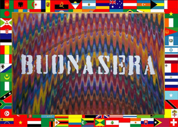 Scaglione in questo modo manifesta di abitare la cultura globale, e questo l'aveva già annunciato nel “Diluvio immaginale” poi ancor più sottolineato nella mostra “la logica cigola”, oggi poi con “Buonasera” va oltre, nel senso che una mostra d'arte non è più il risultato finale di un processo, il suo “happy ending”, ma un luogo di produzione. Le opere infatti hanno una struttura scenografica che ruota attorno alla scrittura che contempla le bandiere del mondo, ovvero il mondo intero, il globale.