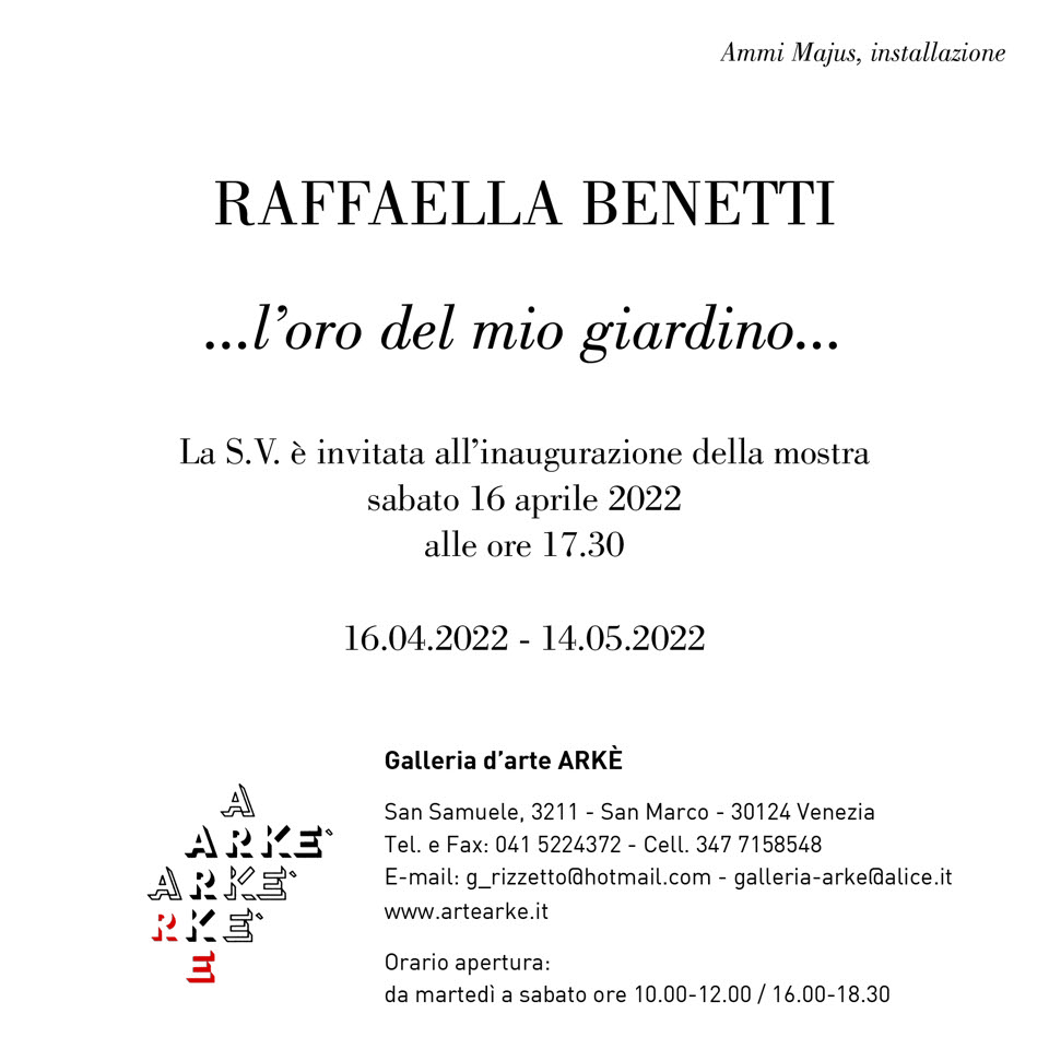 La galleria d’arte moderna e contemporanea Arkè si trasforma in un giardino. Non un giardino qualunque ma quello dell’artista veneta Raffaella Benetti. È un giardino fissato sulla stampa fotografica, sul libro d’artista, con l’acquerello, fuso in bronzo. Un giardino (21 opere dai titoli evocativi) in cui l’oro si rintraccia in innesti preziosi sulle installazioni, ma che va ben oltre la sua rappresentazione.