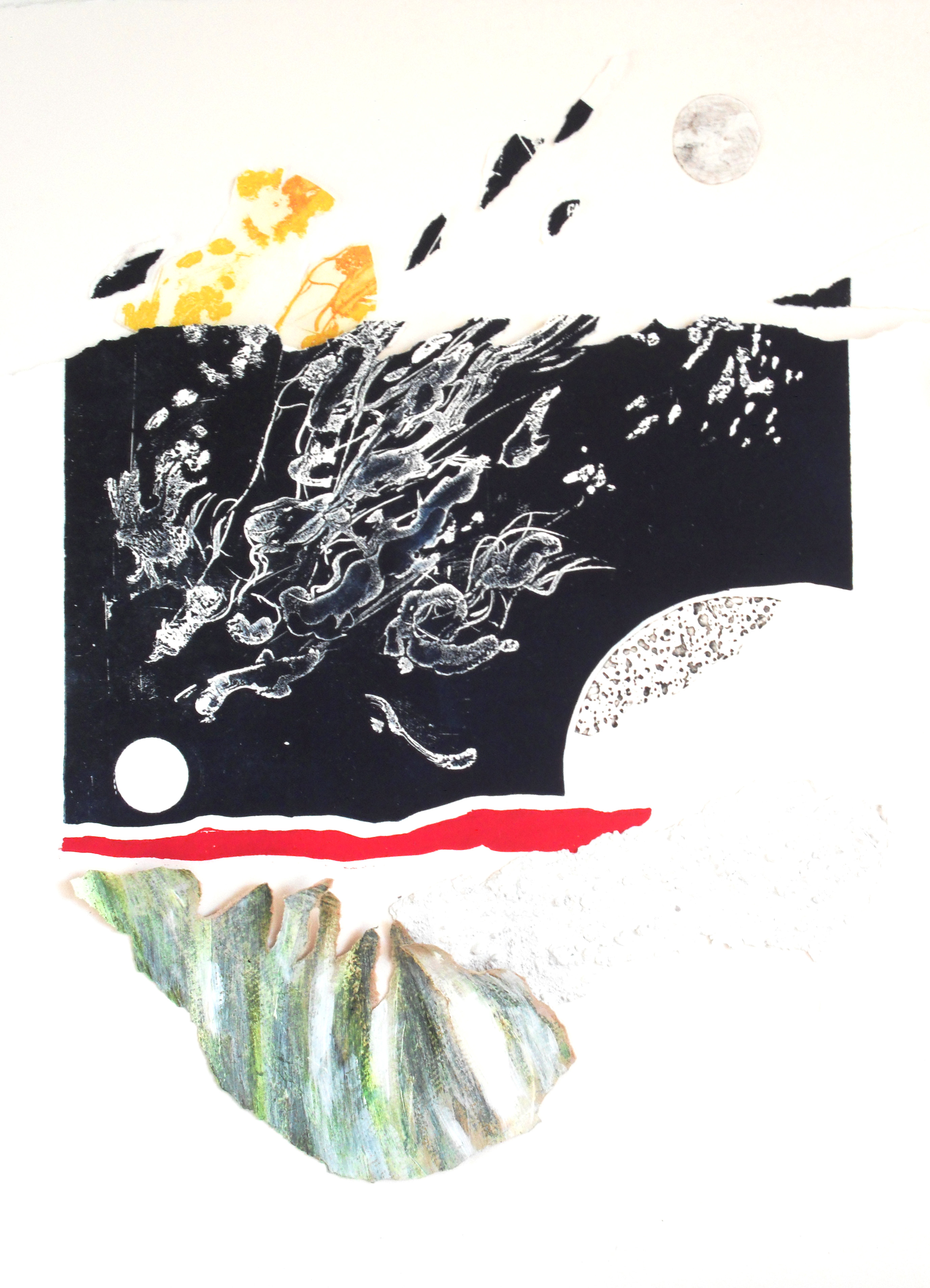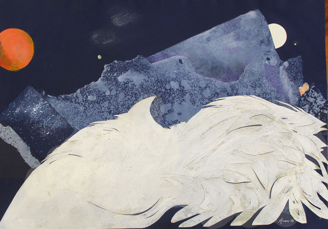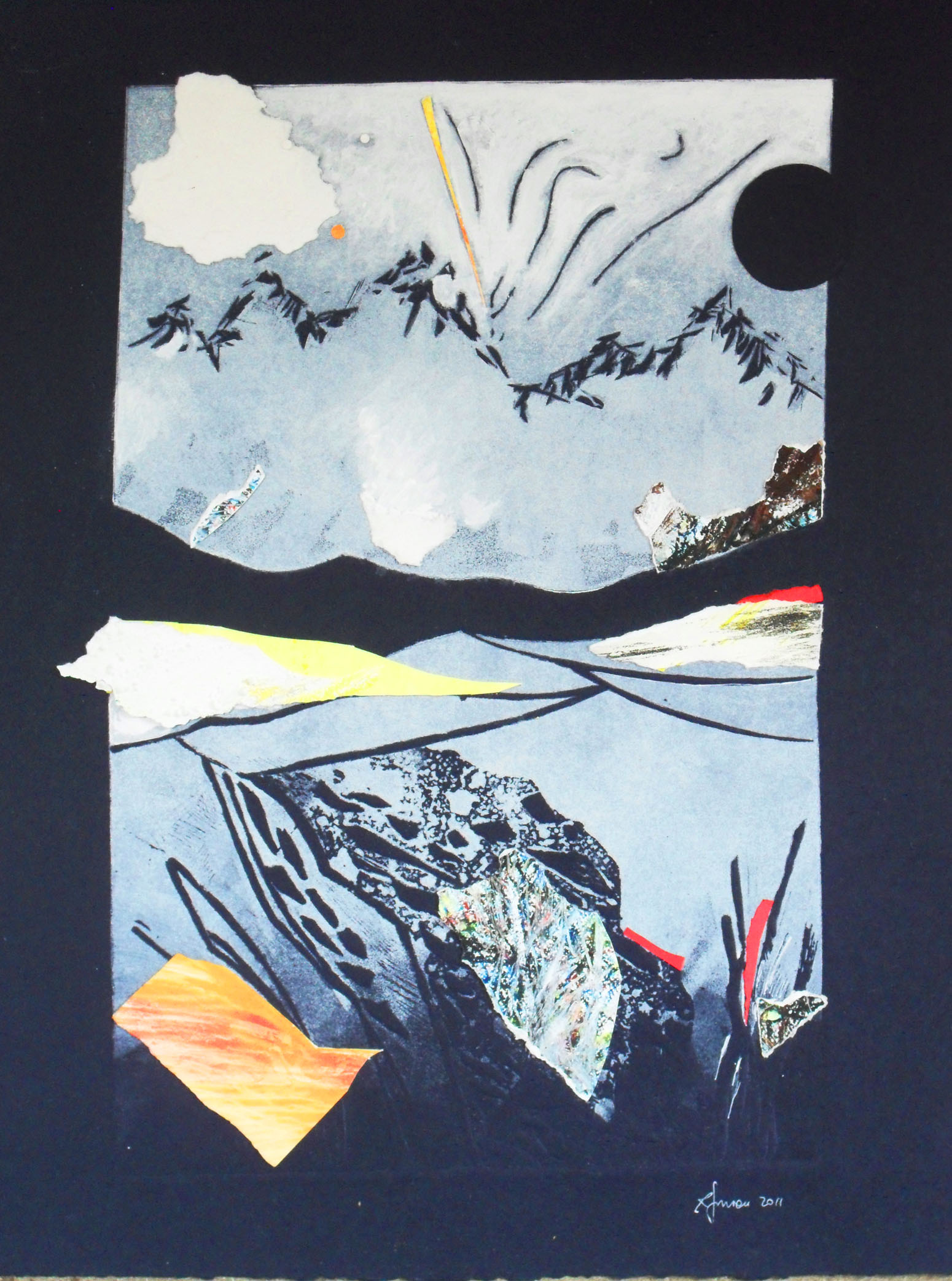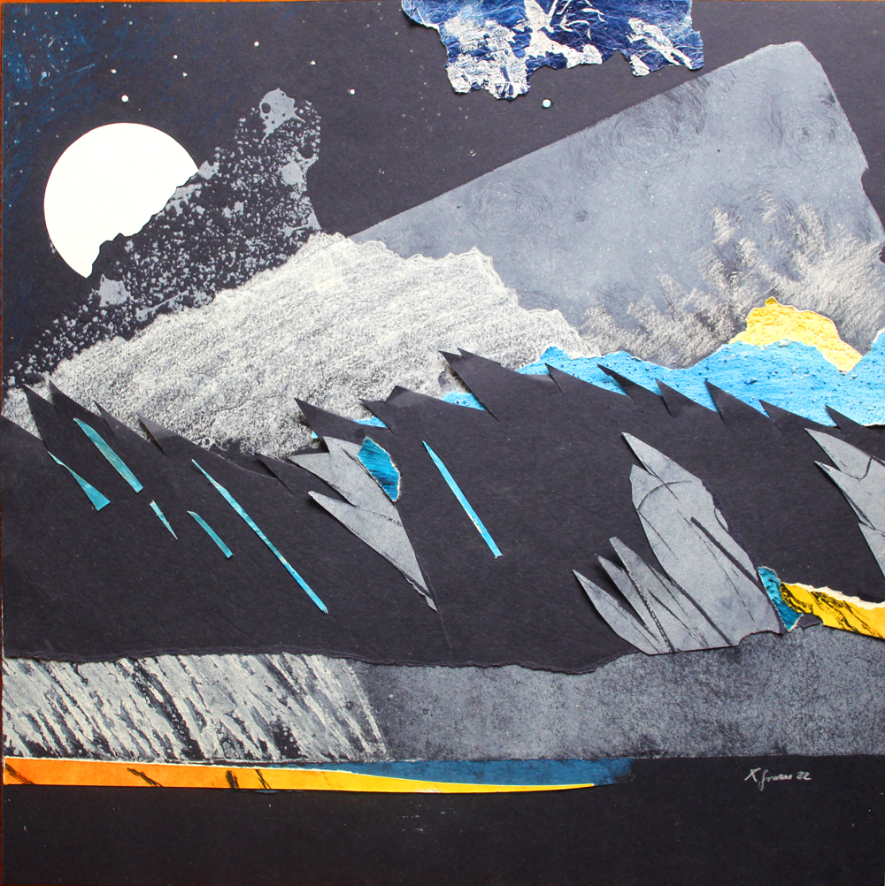 Esposti una ventina di incisioni e raffinati collage, opere di piccole e medie dimensioni, dedicate alla notte stellata, in paesaggi naturali, spesso montani e lacustri, dove la presenza dell’uomo sembra addormentata e in attesa.
