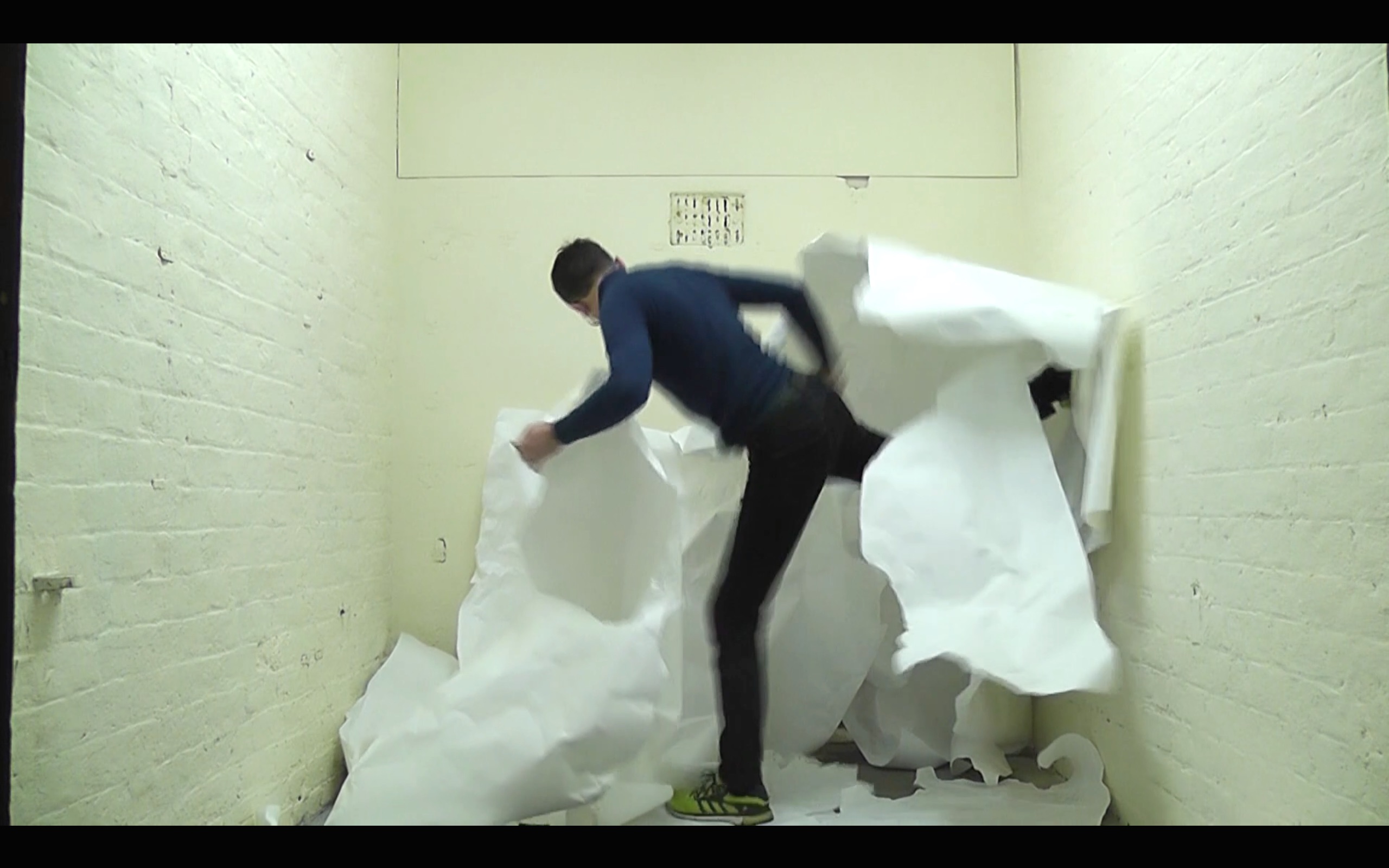 Il lavoro è un documento della sua performance, realizzata nel 2016 nella cella di una prigione. L’artista lavora con la futilità e l’estasi insiti nella resistenza, in questo particolare caso con un frustrante sforzo di fai-da-te – è alle prese con il tentativo di nascondere una sua limitazione –, andando al di là della letteralità della cella della prigione, avvicinandosi piuttosto alla realtà della condizione umana. Una realtà che rimanda al saggio Le mythe de Sisyphe. Essai sur l'absurde di Albert Camus, al Processo di Kafka ma anche a una realtà attuale amara scaturita dal confinamento per contrastare il Covid-19 e dagli effetti causati dall’isolamento forzato. Secondo Boemio: “Se inizialmente sembrano essere azioni senza senso, nel momento nel quale le osserviamo con attenzione incarnano esteticamente la disperazione di vivere; il destino comune dell’uomo. L’artista medium diventa colui che si immedesima nel sopportare il peso dell’esistenza”.
