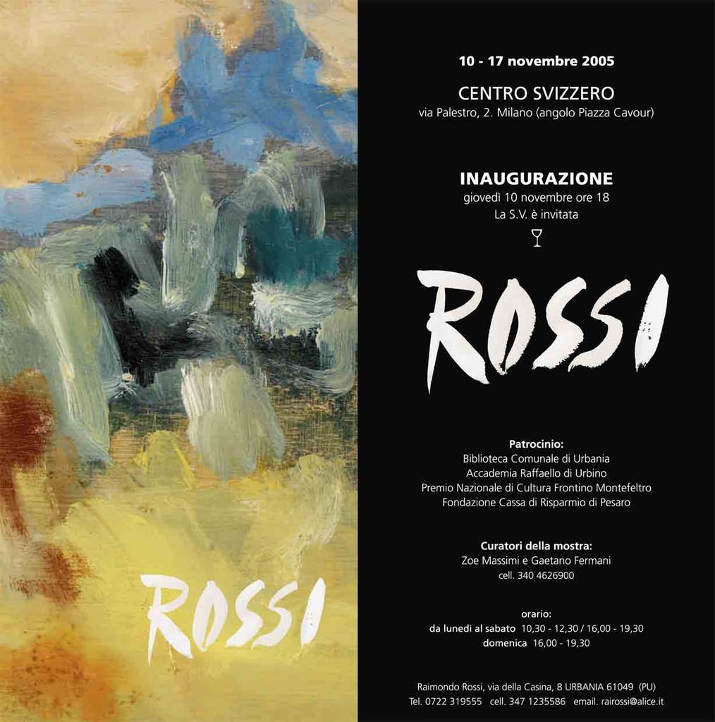Ora, nel pieno della sua maturità, Raimondo Rossi espone per la seconda volta a Milano (la prima, con sole incisioni, nel 1987 presso la biblioteca Sormani). Si tratta stavolta di una scelta di opere che tocca tutte le tecniche in cui la sua multiforme capacità gli consente di esprimersi. Non mancano alcune piccole sculture in bronzo, esemplari unici fusi a cera persa, che la sua curiosità intellettuale ha spinto, in questo 2005, ad eseguire per la prima volta.