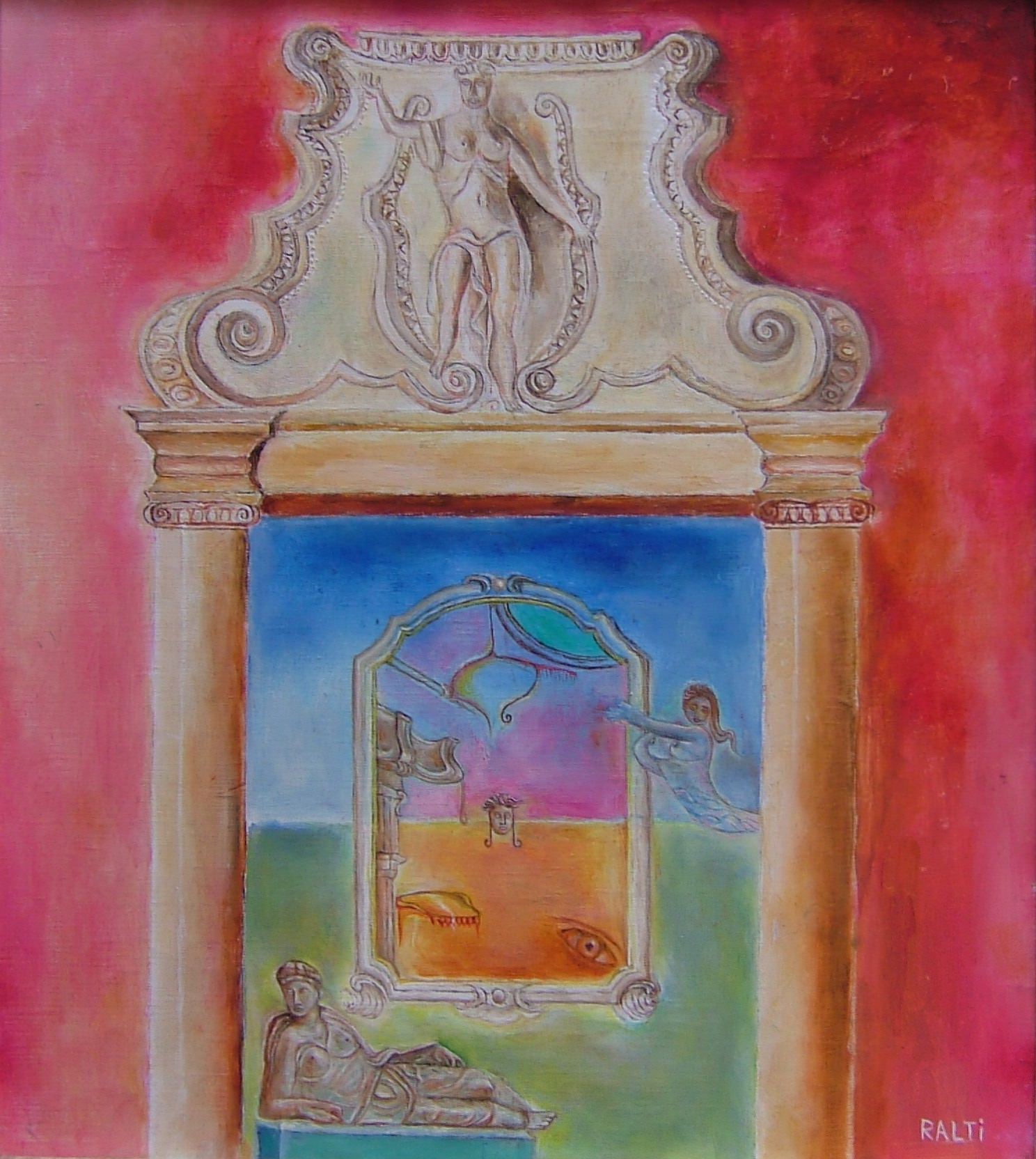 Analizzando invece l’aspetto più profondo, a livello semantico/simbolico dell’operato di Ralti, si può riscontrare una poetica stilistica e contenutistica molto specifica dove il nuce dell’opera è tracciata da sottili metodologie esecutive e da schemi visivi rivolti ad una realtà legata al sogno-mito-pensiero. Nasce così spontaneo, parlare di una tipologia di lavoro artistico mitopoetico, dove il linguaggio simbolista porterebbe al centro dell’opera non solo la forma esteriore sistemica dello schema prospettico ma il significato dei singoli oggetti/simbolo che Ralti in ogni sua opera vuole raccontare. In quegli spazi, dove il tempo rimane sospeso, la visione dello spettatore è rassicurata dalla tonalità cromatica calda che emana un senso di messaggio positivo.
