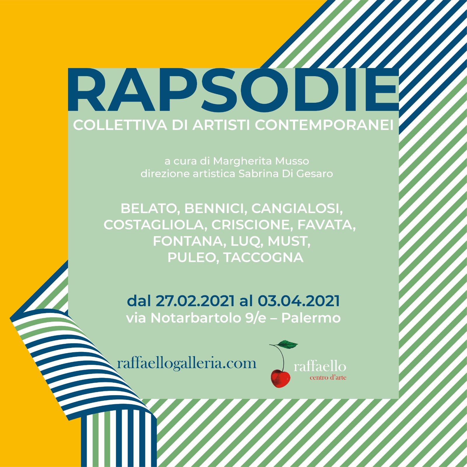 Il Centro d'arte Raffaello, diretto da Sabrina Di Gesaro, organizza una collettiva, a cura di Margherita Musso, dal titolo “RAPSODIE | composizione di luce e colore ” che riunirà opere uniche tra pittura e scultura di artisti contemporanei che, come in una composizione musicale dal ritmo vario, esibiranno i loro virtuosismi, acrobazie di tinta e contrasti di luce. L'esposizione avrà inizio sabato 27 febbraio ore 18:00 negli spazi di via Notarbartolo 9/e a Palermo.