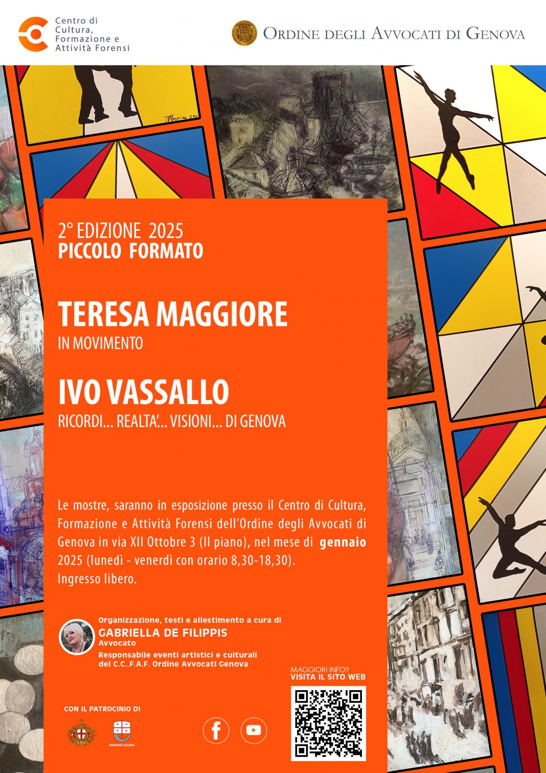 Anche quest’anno prosegue, con la I edizione, la RASSEGNA DEL PICCOLO FORMATO, esposizione di opere di diverse dimensioni ma non superiori a 30 x 30 cm che ogni mese vede esposte, nei locali del Centro Cultura Formazione e Attività Forensi, in via XII ottobre 3, le opere di diversi noti artisti prevalentemente genovesi.