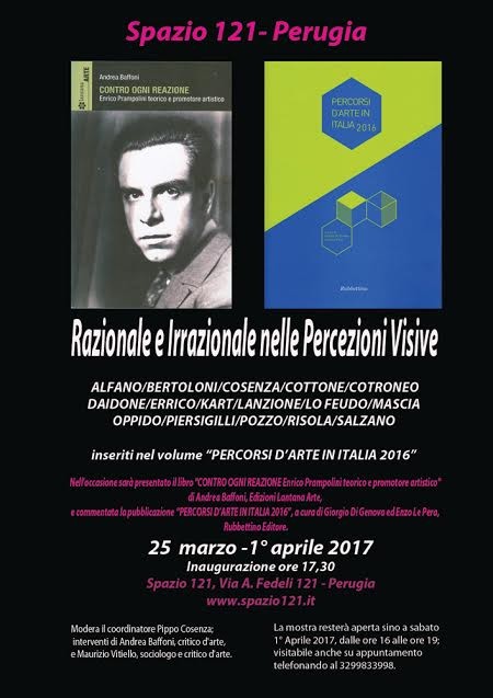 Sabato 25 marzo 2017, alle ore 17, presso lo "Spazio 121" Via A. Fedeli n. 121 Perugia, inaugurazione della mostra, a cura di Maurizio Vitiello, con il coordinamento di Pippo Cosenza, "Razionale e Irrazionale nelle Percezioni Visive", con opere di Andrea Alfano, Angelisa Bertoloni, Pippo Cosenza, Carlo Cottone, Giuseppe Cotroneo, Maria Pia Daidone, Carlo Errico, Arnhild Kart, Mario Lanzione, Adele Lo Feudo, Luciana Mascia, Salvatore Oppido, Cecilia Piersigilli, Gustavo Pozzo, Myriam Risola, Antonio Salzano, inseriti nel volume “PERCORSI D’ARTE IN ITALIA 2016”.