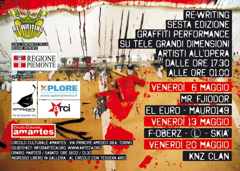 Giunge alla sesta edizione Re-Writing, rassegna nata per riscrivere in chiave simbolica tags e graffiti cancellati per le pulizie olimpiche. Le tre tele lunghe cinque metri, realizzate a maggio dagli artisti invitati, andranno ad aggiungersi ai cinquantacinque già realizzati per raggiungere la lunghezza di settanta metri.