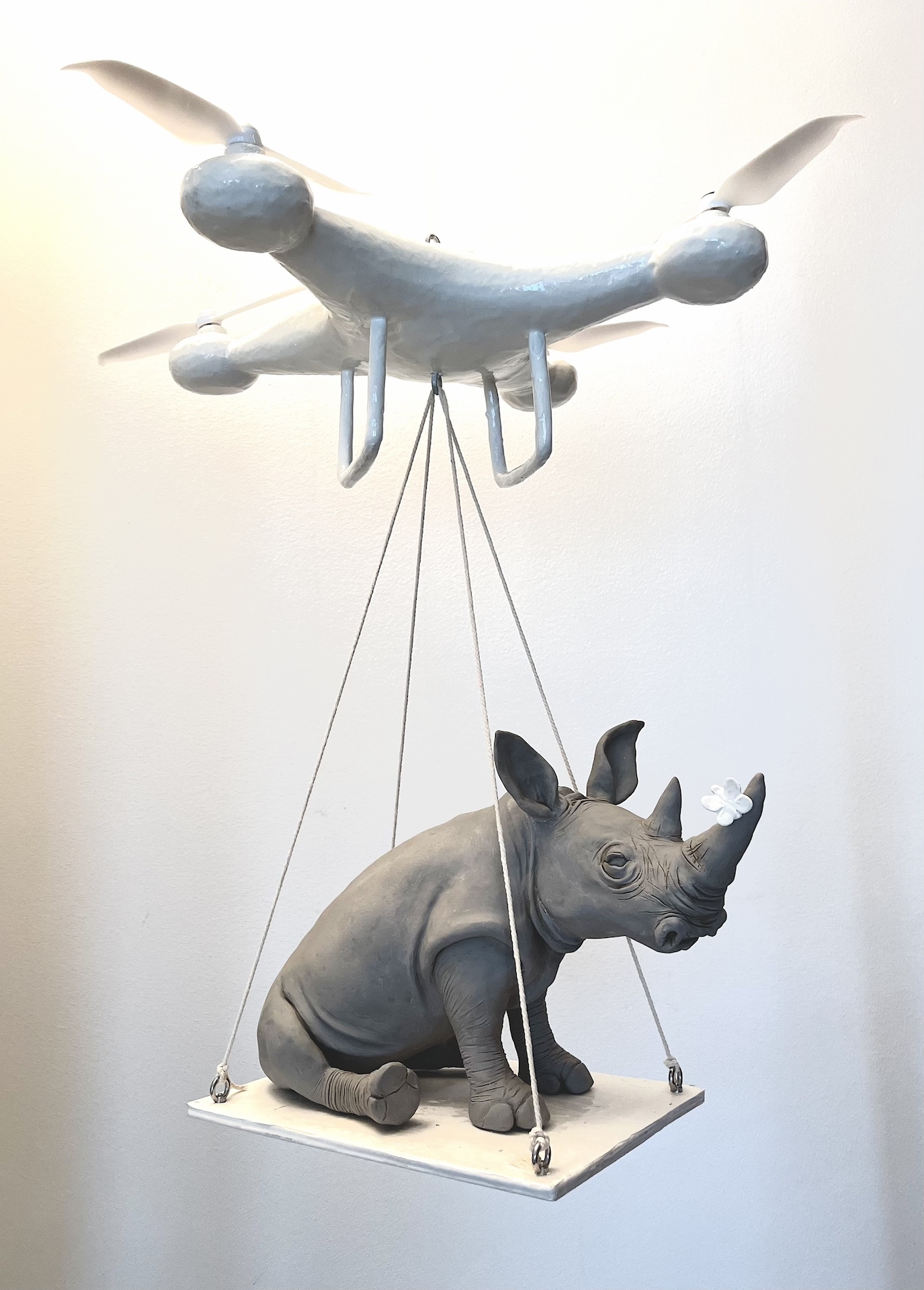 alcuni lavori, come il rinoceronte che vola con un drone nel tentativo di sollevarci