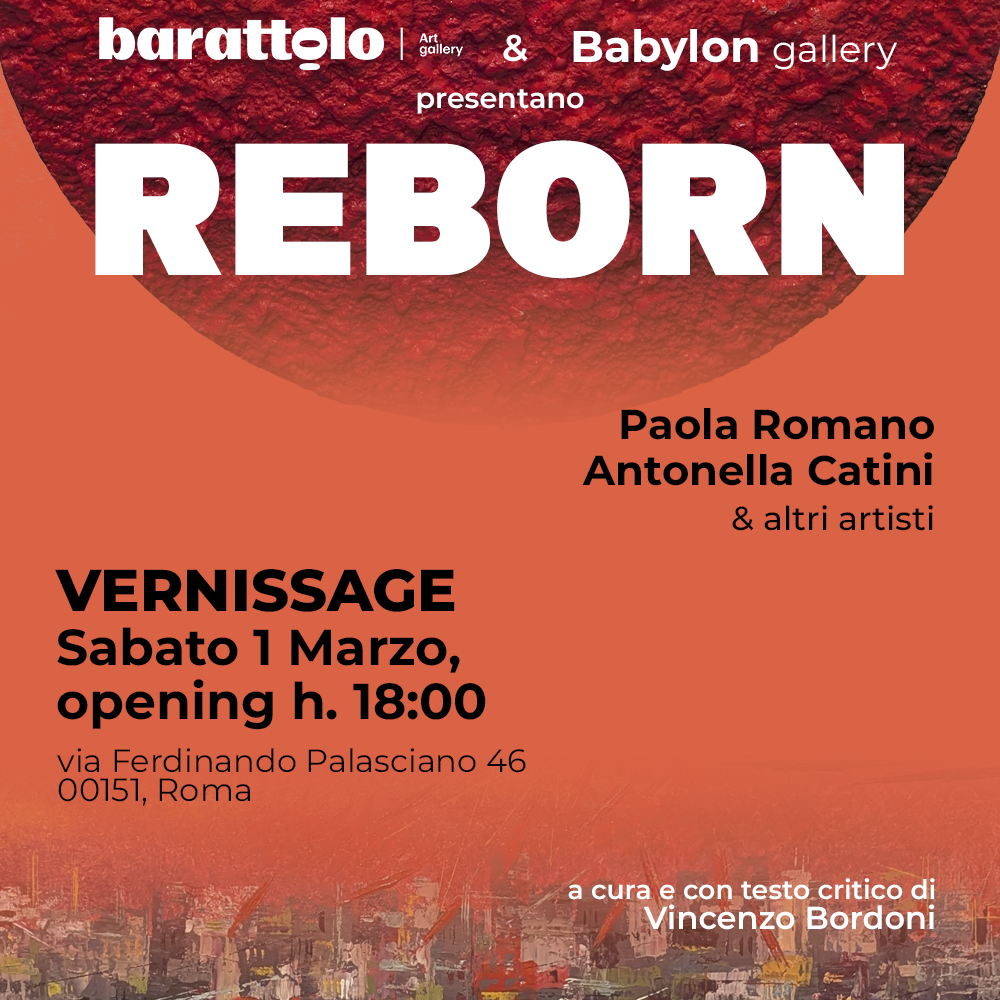 Le gallerie d'arte sono luoghi di incontro tra visione e materia, spazi in cui il tempo si stratifica nell’opera. Con questo spirito nasce REBORN, un’esposizione che segna un nuovo inizio per due realtà artistiche: Galleria Barattolo e Babylon Gallery. La mostra, curata da Vincenzo Bordoni, vedrà protagoniste le opere di Paola Romano, Antonella Catini e altri artisti selezionati, uniti da un comune desiderio di ridefinire il presente attraverso l’arte.